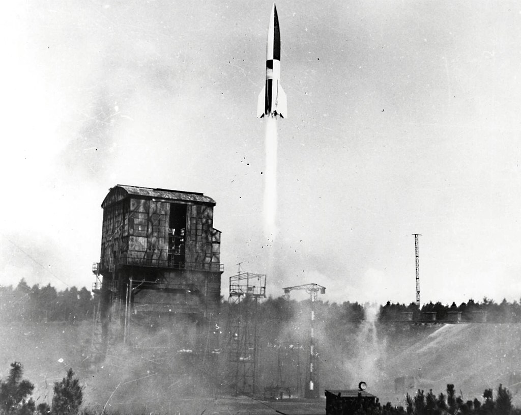 (German Federal Archives/Cygni_18; CC BY-SA Photo)aunch of a V-2 rocket from Test Stand VII at Peenemünde, Germany, to its first successful flight. The rocket reached an altitude of 84.5 kilometres, 3 October 1942.
