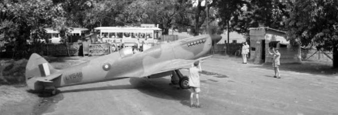 Supermarine Spitfire Mk. VIII (Serial No. LV648), prepares to move from its dispersal point on the Maidan in Calcutta, India to take off on the Red Road.  This area of central Calcutta was cordoned off to traffic and used as an airstrip for the defence of the city from Japanese air raids, ca 1945.