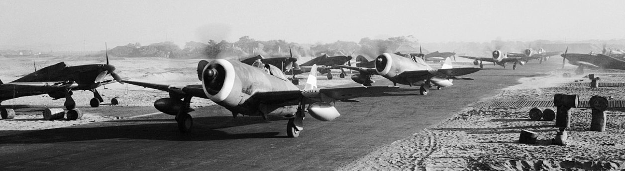 Republic Thunderbolts of No. 30 Squadron RAF taxy to their take-off point past a line of Hawker Hurricane Mk. IICs, at Cox’s Bazar, India, ca 1945.