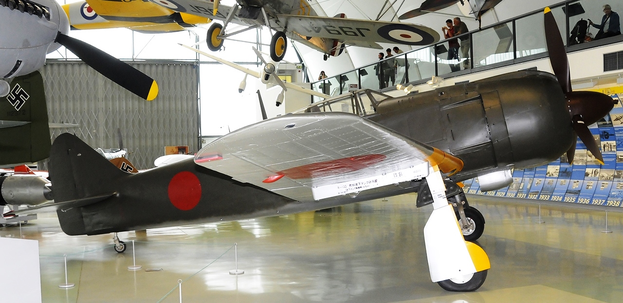 Kawasaki Ki-100-1b Type 5 fighter, RAF Museum Cosford, England. This is the only surviving example. It was one of 24 found at Tan Son Nhut Airfield in what was then French Indo-China. It was briefly made airworthy, but soon suffered a wheels-up landing after which it did not fly again. It was shipped to the UK during 1946 and was then stored at various locations for the Air Historical Branch, making occasional static appearances. In 1985 she moved to RAF St Athan and was returned to ground running condition, but the collection was dissolved in 1989 and the Ki-100 joined the Cosford Aerospace Museum. In 2003 it underwent further restoration before going on display in the ‘Milestones of Flight’ Hall at Hendon. She remained there until 2011 when she came back to Cosford and is currently on display in the ‘War in the Air’ hangar. RAF Museum, Cosford, Shropshire, UK.