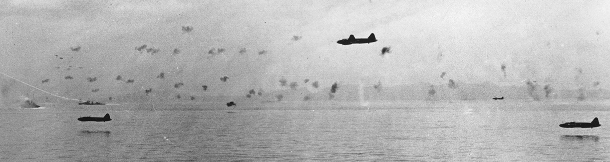 IJNAF aviators flying Mitsubishi G4M codenamed “Betty” bombers pressing home a torpedo attack against American ships off Guadalcanal with heavy losses, on 8 August 1942.