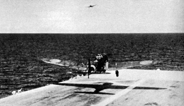 A Japanese Nakajima B5N2 “Kate” torpedo aircraft (visible just above and to the right of carrier’s island) drops a torpedo (splash at lower right) that will hit the U.S. Navy aircraft carrier USS Hornet (CV-8) and cause fatal damage on 26 October 1942.
