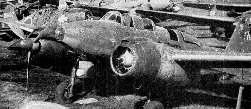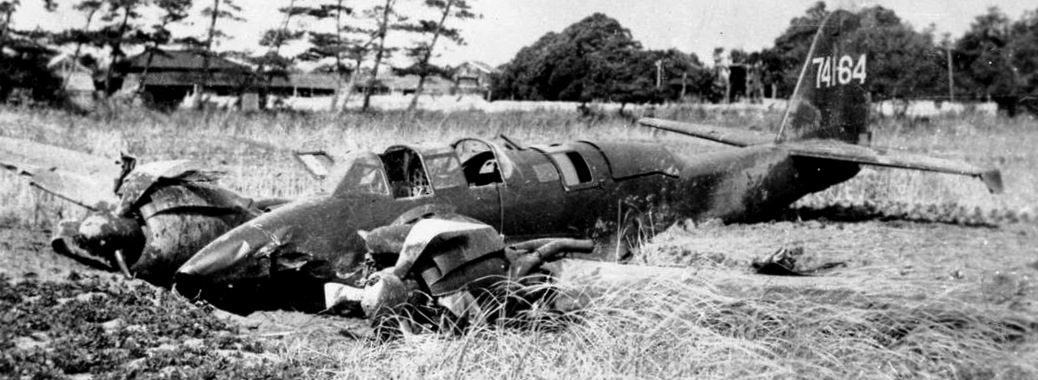Yokosuka Naval Air Depot, 1945 after occupation by US Navy.  Note the Nakajima J1N1-S Gekko “Irving” night fighter. The pointed nose is obscured since the left engine is behind it, but quad radar antennae are clearly visible. Another J1N1-S nose is visible in the lower left corner.
