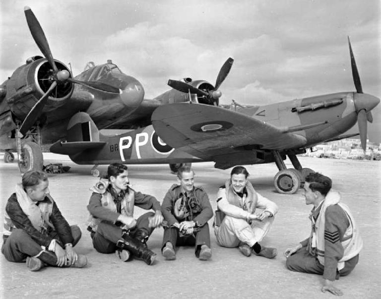 Five Malta-based pilots sitting in front of two fighter aircraft at Luqa. Third and fourth from the left, respectively are, Wing Commander J K Buchanan, Commanding Officer of No. 272 Squadron RAF, and Wing Commander M M Stephens, leader of the Hal Far Fighter Wing, shortly before the end of his tour of operations. Behind them is Wing Commander P P Hanks’ Supermarine Spitfire Mark VC, BR498 ‘PP-H’, which he flew as leader of the Luqa Fighter Wing, parked in front of a Bristol Beaufighter of No. 272 Squadron RAF.
