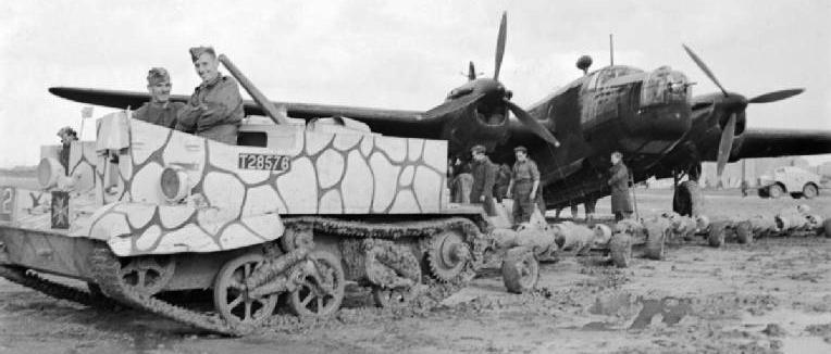 A Bren gun carrier of the Malta Garrison tows a trolley-load of 250-lb GP bombs to a Vickers Wellington in its dispersal at Luqa.