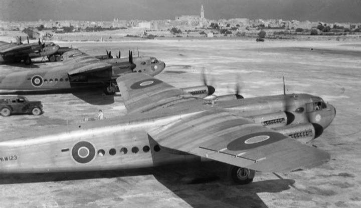 Avro York C Mark Is of No. 47 Group RAF lined up at Luqa, Malta, while staging through to the Far East. In the foreground, MW123 of No. 511 Squadron RAF starts to taxi out.