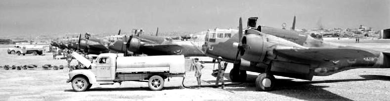 Martin Baltimore Mk. IVs of No. 223 Squadron RAF Detachment at Luqa, Malta, being refuelled and loaded with bombs for a raid on enemy positions around Catania, Sicily.