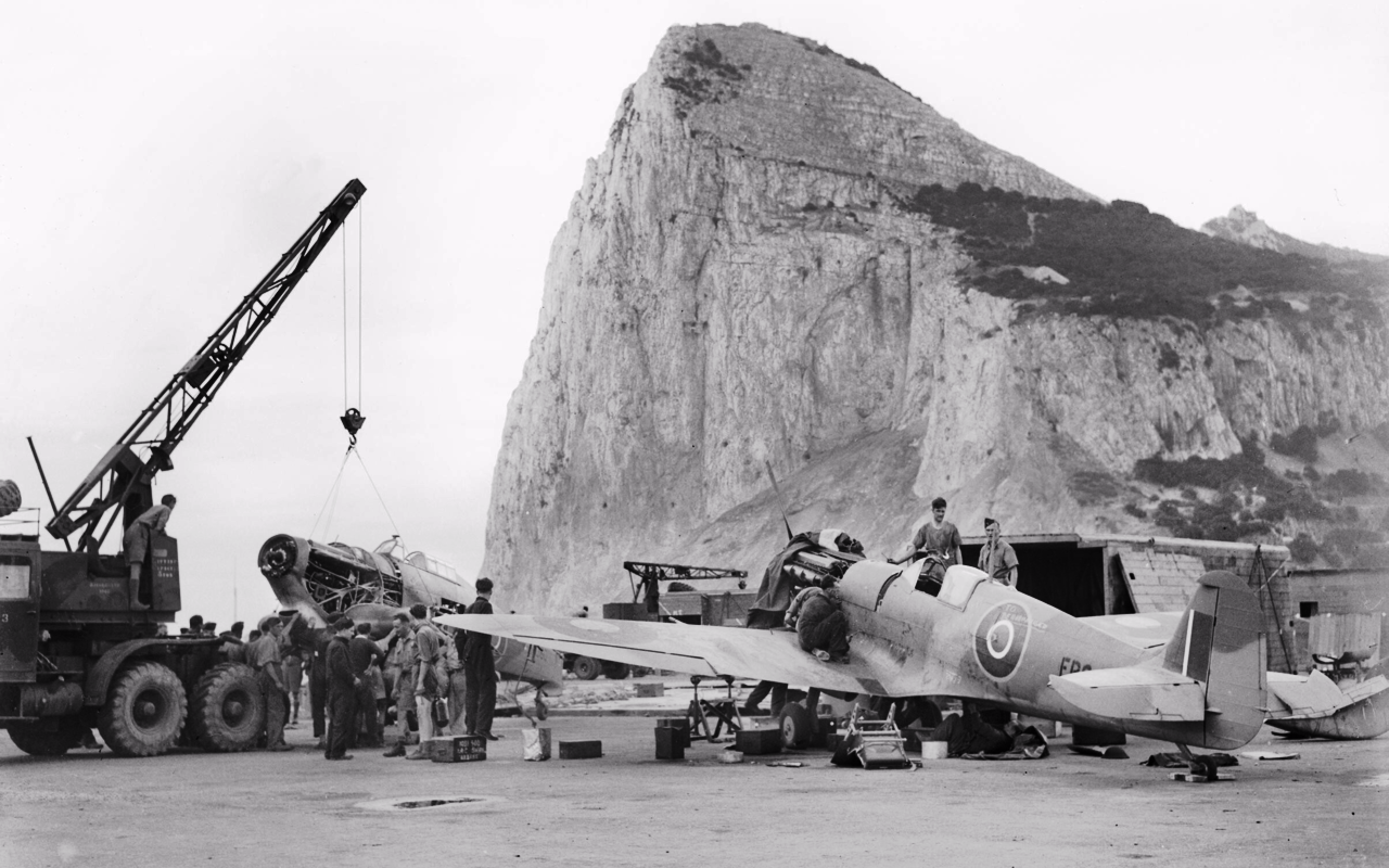 Supermarine Spitfire Mark Vs assembled by the Special Erection Party for Operation TORCH, undergoing initial engine tests at North Front, Gibraltar. The Special Erection Party was established at Gibraltar in July 1942 to assemble and test fly aircraft crated from Britain by sea for the reinforcement of Malta. On 28 October 1942 an unexpected shipment of 116 Spitfires and 13 Hawker Hurricanes arrived to be prepared for the Allied landings in North Africa (Operation TORCH) and a further shipment was received a few days later. Despite shortages of personnel, the SEP, assisted by soldiers of the Malta Brigade, assembled, test-flew and cannon-tested all the aircraft in time for the commencement of the Operation (8 November).