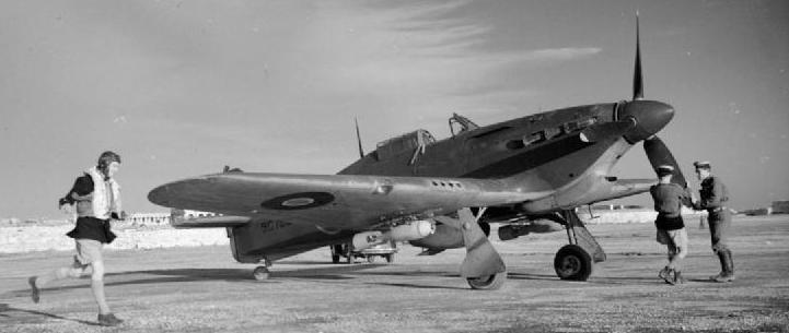 Fleet Air Arm pilot running to his Hawker Hurricane which stands ready on an airfield in Malta uring the Second World War. ca 1942.