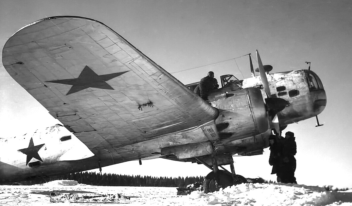 Aircrew and aircraft mechanics preparing a Soviet DB-3B long-range bomber of the 1st Guards Mine-Torpedo Aviation Regiment of the 8th Bomber Aviation Brigade of the Air Force of the Baltic Fleet for departure.