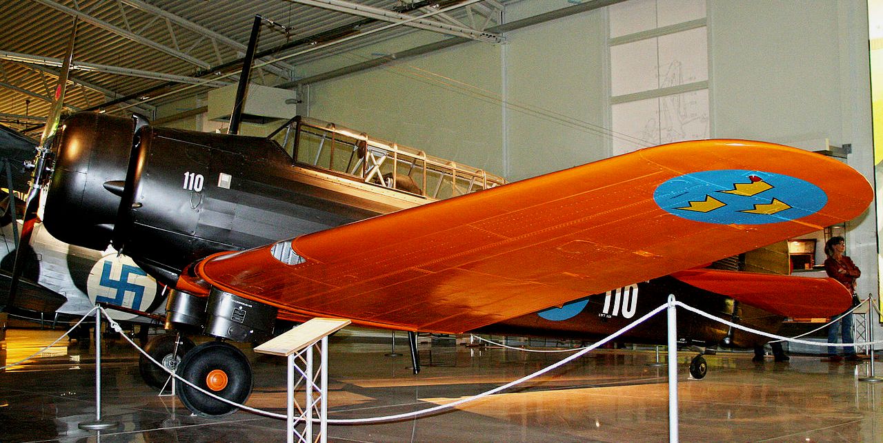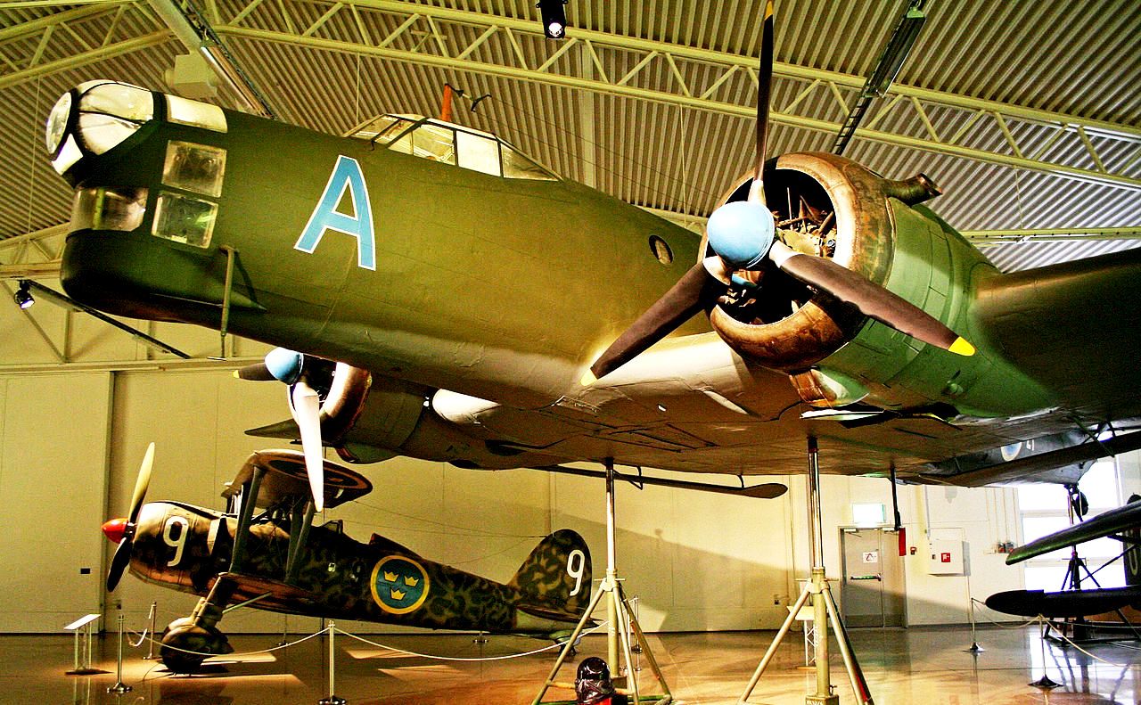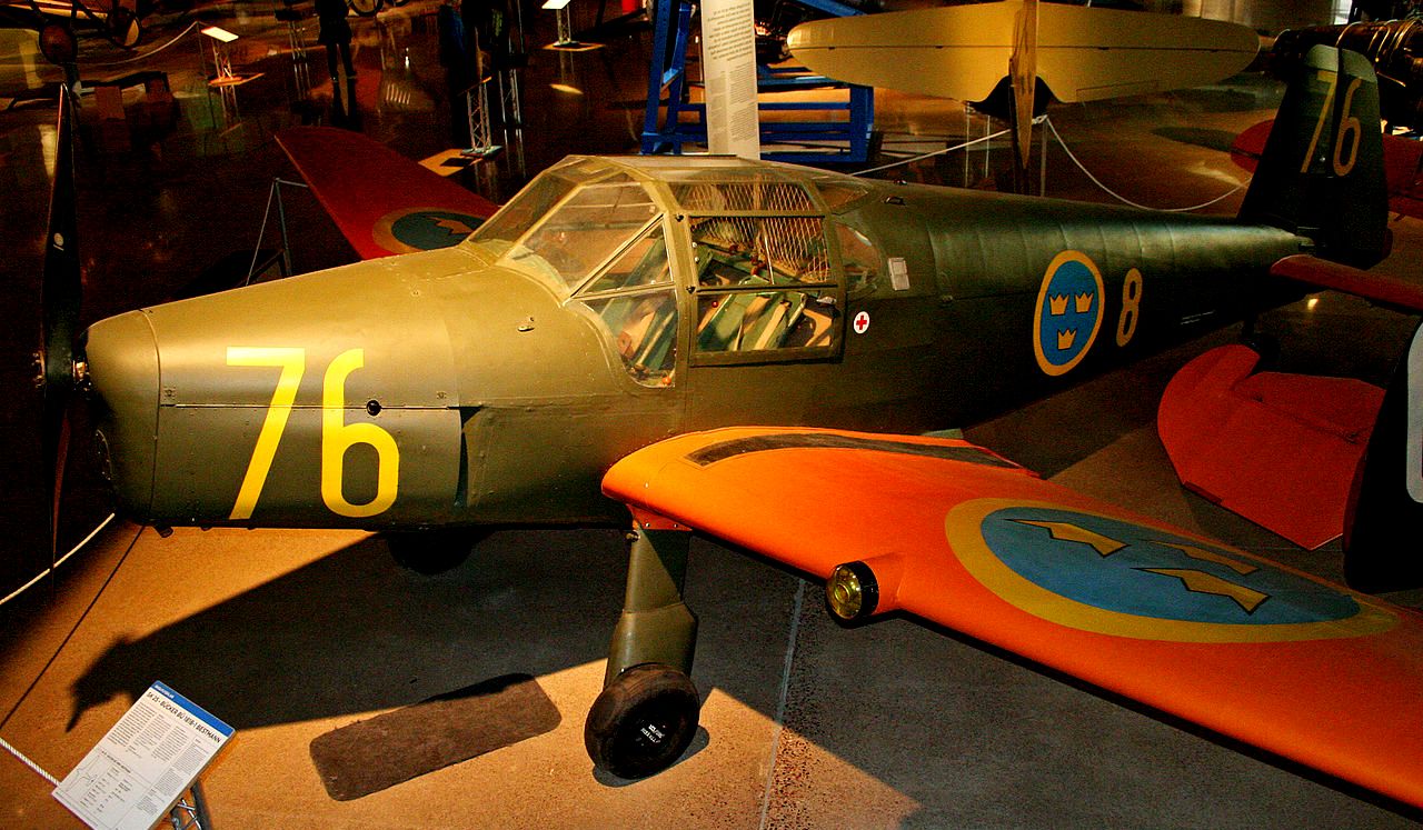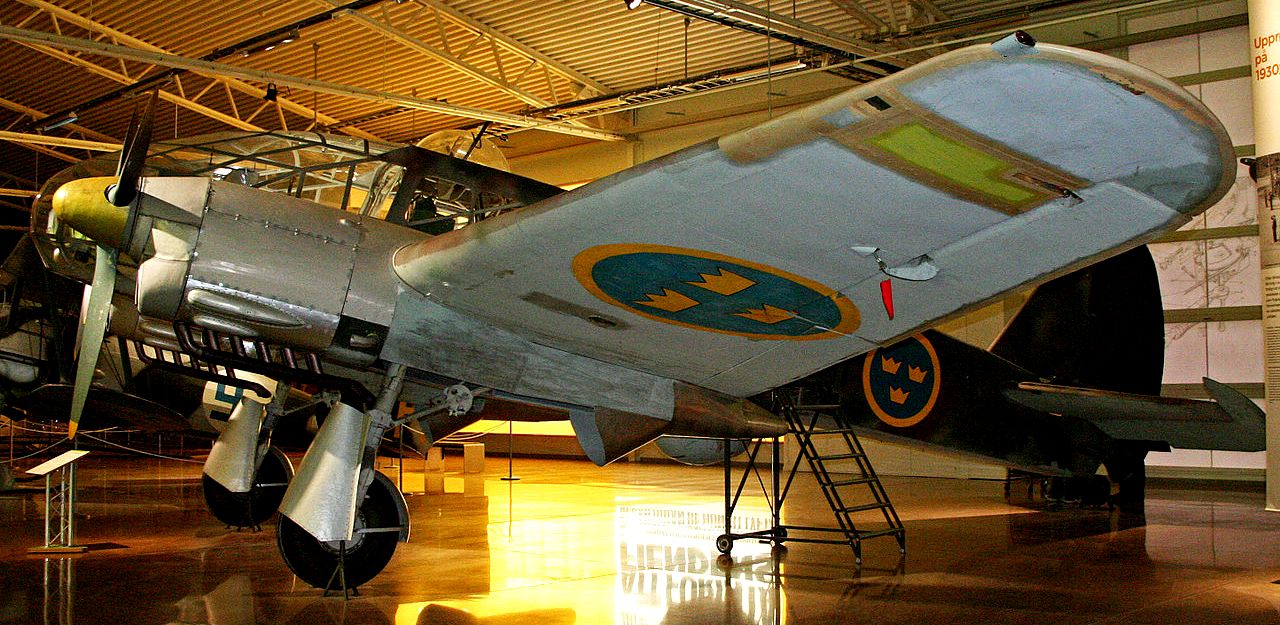 Saab B18B (Serial No. 18172), “Red David“.  The B model was a dive bomber variant.  This aircraft was one of a group of eight B18Bs and a single Junkers Ju 86 that were lost in a snowstorm in the fall of 1946.  It was finally recovered in 1979 and is the only existing B18.  Restoration of this aircraft was completed in 2020.  It is the only remaining example in existence.  Flyvapenmuseum, Malmen.