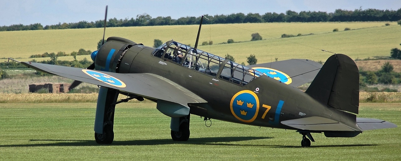 The Swedish Air Force was created on 1 July 1926 when the aircraft units of the Army and Navy were merged.  Because of the escalating international tension during the 1930s the Air Force was reorganized and expanded from four to seven squadrons.  When the Second World War  broke out in 1939 further expansion was initiated and this substantial expansion was not finished until the end of the war.  Although Sweden never entered the war, a large air force was considered necessary to ward off the threat of invasion and to resist pressure through military threats from the great powers.  The Flygvapnet bought aircraft from a number of other nations.  These included the J-7 Bristol Bulldog and the J-8A/B Gloster Gladiator Mk I & II from the UK; 60 J-9 Seversky EP-106 (P-35) from the USA (60 others were impounded by the USAAC); 72 J-11 Fiat CR.42 and 60 Reggiane Re.2000 from Italy; 50 North American P-51D Mustangs (purchased in April 1945); 56 B-3/A/B/C Junkers Ju 86K built under licence;  15 B-4 Hawker Hart light biplane bombers; 91 B-5B/C Northrop A-17A; and 31 B-16 Caproni Bergmaschi Ca.312s.  As the war progressed, Sweden developed its own aircraft designs, including the SAAB J-21A pusher fighter in 1945 which was later modified to the J-21R jet fighter; and the FFVS J-22 monoplane fighter in 1945.  The Swedish designated their bombers as the B-17A/B/C single-engine light level, reconnaissance and dive bomber from 1941; and the B-18 twin-engine medium bomber.