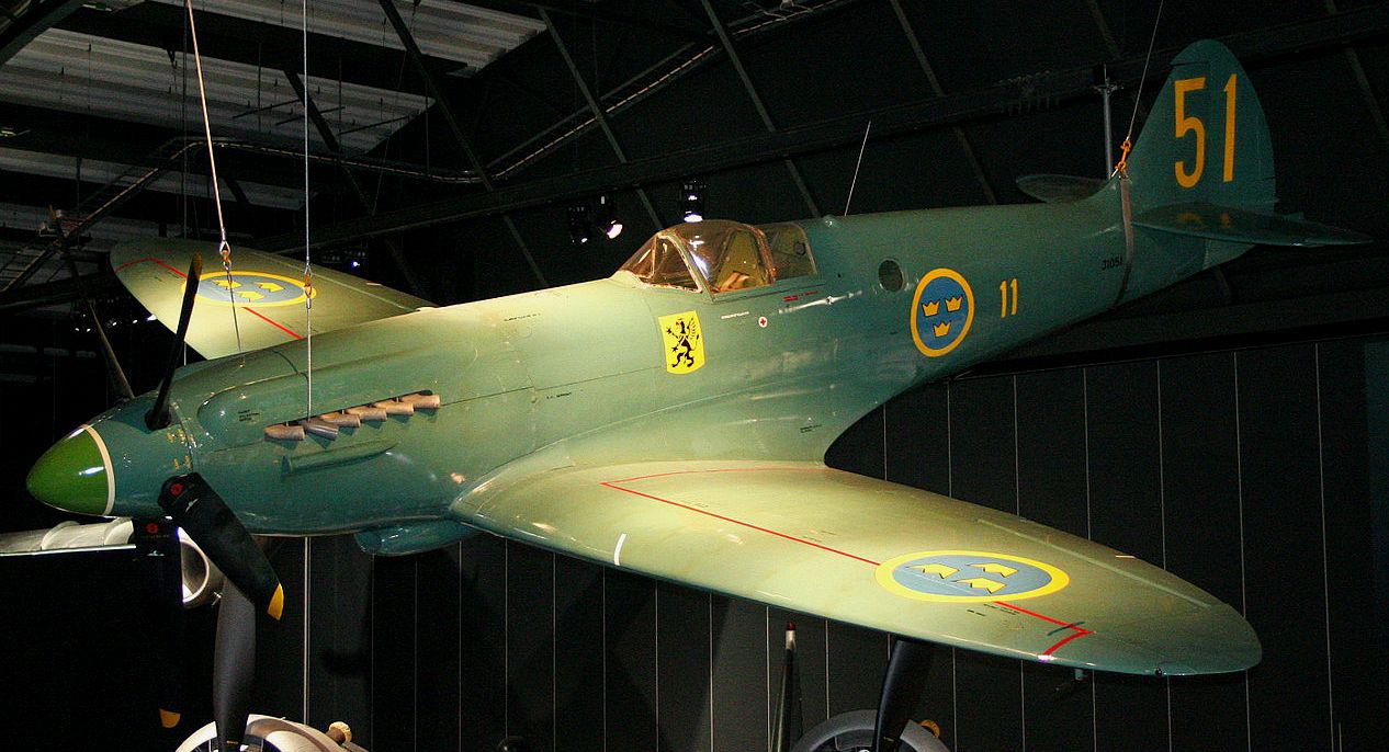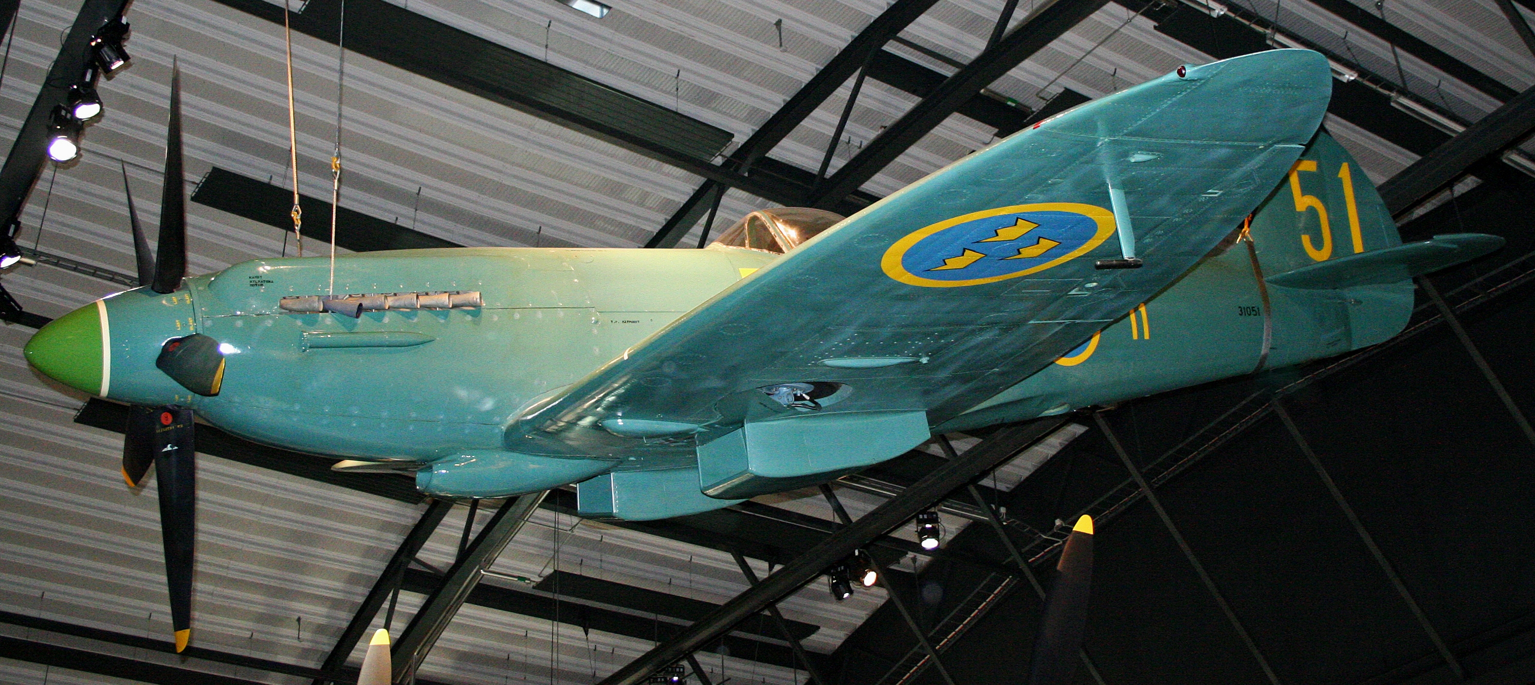 Supermarine Spitfire PR Mk. XIX (Serial No. PM627), 51.  This aircraft did not serve with the Swedish Air Force.  After RAF service it went to India where it flew as (Serial No. HS964).  It was later purchased by the Flyvapenmuseum and returned to Sweden to represent one of the types that flew in Swedish service.  It was given the “next-in-line” (Serial No. 31051), as the last actual Spitfire in service with the Swedish Air Force was (Serial No. 31050).   It is painted as a fighter serving with unit F11 , 6S/683524, and is on display in the Cold War Hall at the Flyvapenmuseum, Malmen.