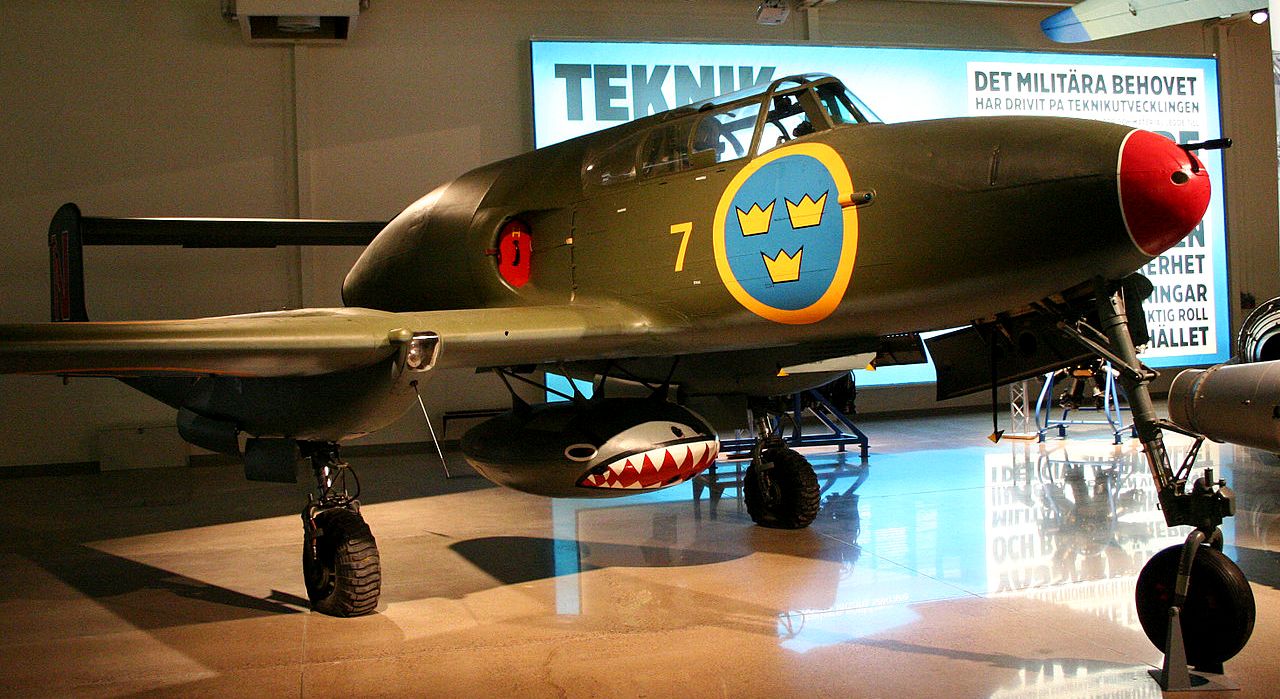 SAAB J21R (Serial No. Fv21286).  The J21R was developed from the J21A, making one of only two jet types to be successfully converted from piston powered aircraft, the other being the Yak-15 which was a conveted Yak-9.  This aircraft is a J21A which was converted into a J21R for display in the museum.  As well as the fuselage, the tailplane and fins are heavily modified.  Flyvapenmuseum, Malmen.
