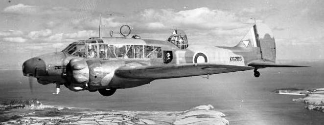 Anson Mk. I (Serial No. K6285), of No. 321 (Dutch) Squadron RAF based at Carew Cheriton, Pembrokeshire, in flight north-west of Tenby, ca 1943.