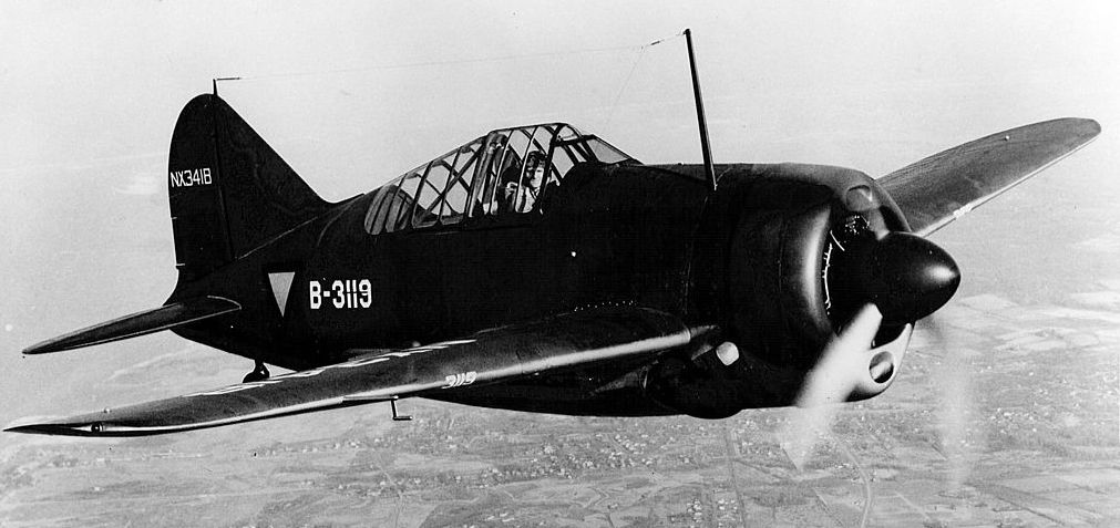 The first Dutch Brewster B-339D Buffalo (Serial No. B-3119) in flight in the United States prior to its delivery to the Militaire Luchtvaart van het Koninklijk Nederlands-Indisch Leger (Military Air Service of the Royal Netherlands East Indian Army, ML-KNIL). Note the civil registration NX341B on the tail. The aircraft escaped from the Netherlands East Indies and was later used by the U.S. Army Air Forces in Australia.