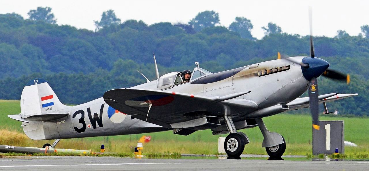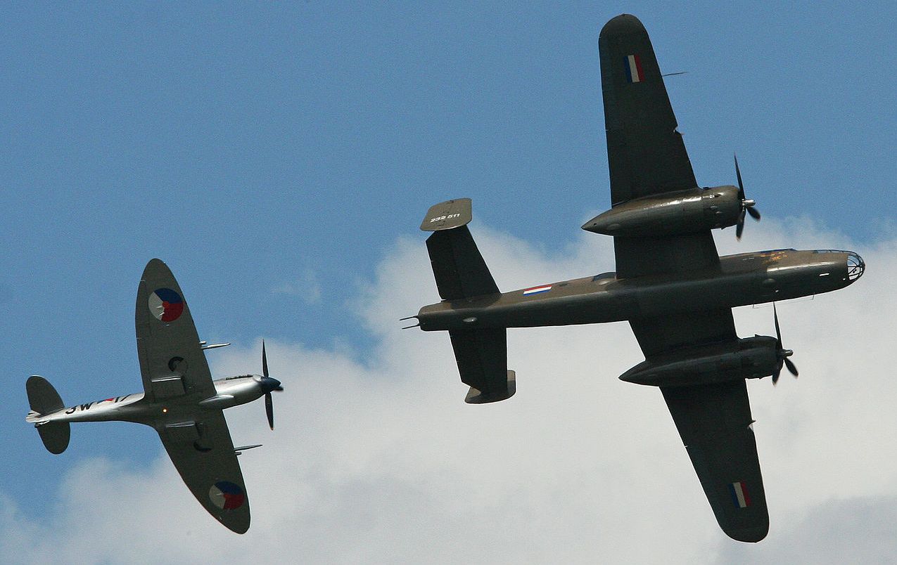 North American VB-25 Mitchell, USAAC (Serial No. 44-29507), c/n 180-32782, operated by the Duke of Brabant Air Force. Supermarine Spitfire Mk. IXc (Serial No. MK732), c/n CBAF.IX1732, OU-Q, flew over the Normandy beaches on D-Day with 485 Sqn and shot down a Messerschmitt Bf 109 on 8 June 1944. Reg. No. PH-OUQ.