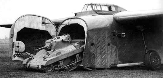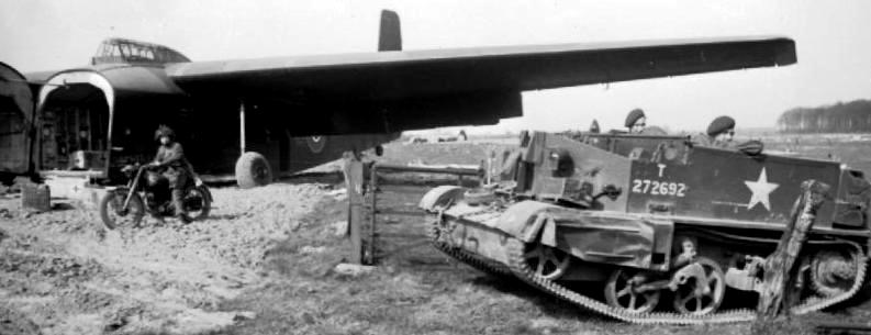 General Aircraft Limited GAL. 49 Hamilcar with a Universal carrier unloaded fduring the Rhine crossing, 24-25 March 1945. Hamilcars were only used on three occasions, and only in support of British airborne forces. They first saw action in June 1944, when approximately thirty were used to carry 17-pounder anti-tank guns, transport vehicles and Tetrarch light tanks into Normandy in support of British airborne forces during Operation Tonga. In September 1944 a similar number of Hamilcars were used to transport anti-tank guns, transport vehicles and supplies for airborne troops as part of Operation Market Garden. They were used a third and final time in March 1945 during Operation Varsity, when they transported M22 Locust light tanks and other supplies. The gliders proved to be successful in all three operations, although their slow speed and large size made them easy targets for anti-aircraft fire, which resulted in a number of gliders being damaged or destroyed.