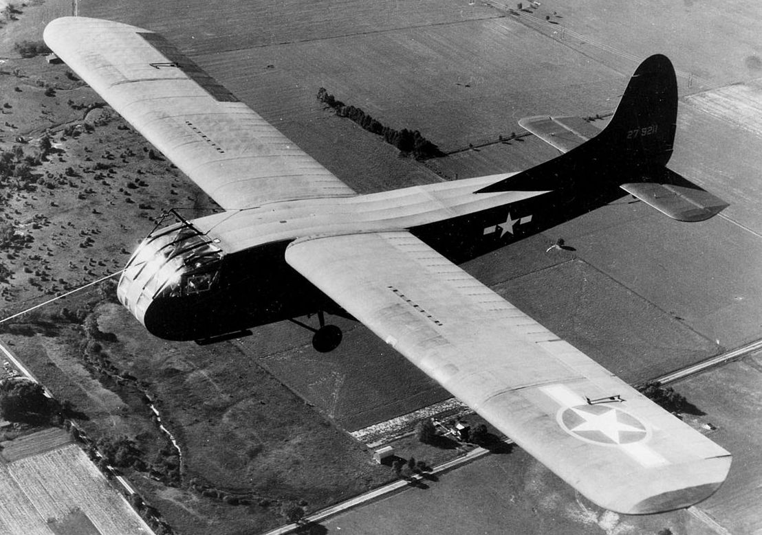 Waco CG-4A-WO Hadrian glider, USAAF (Serial No. 42-79211, 31 Dec 1942. The CG-4A could carry 13 troops and their equipment. Cargo loads could be a 1⁄4ton truck (i.e. a Jeep), a 75-mm pack howitzer, or a 1⁄4ton trailer, loaded through the upward-hinged nose section. Douglas C-47 Skytrains were usually used as tow aircraft.