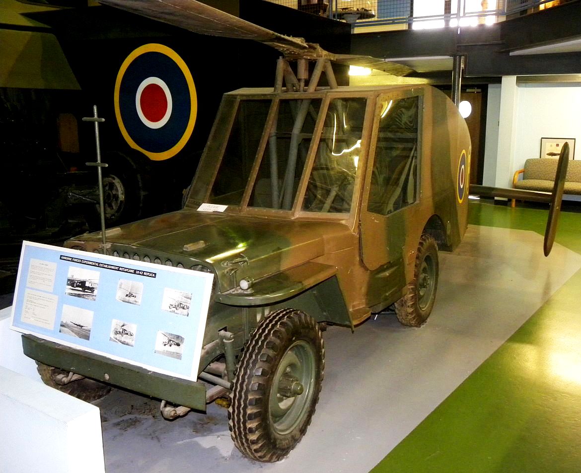 Hafner Rotabuggy (Serial No. B415), Museum of Army Flying, Middle Wallop, Hampshire. This is a replica based on an original Jeep (not a Willyâs MB like the original) and the rest is new build other than the rotors which possibly came from a Bristol Sycamore.