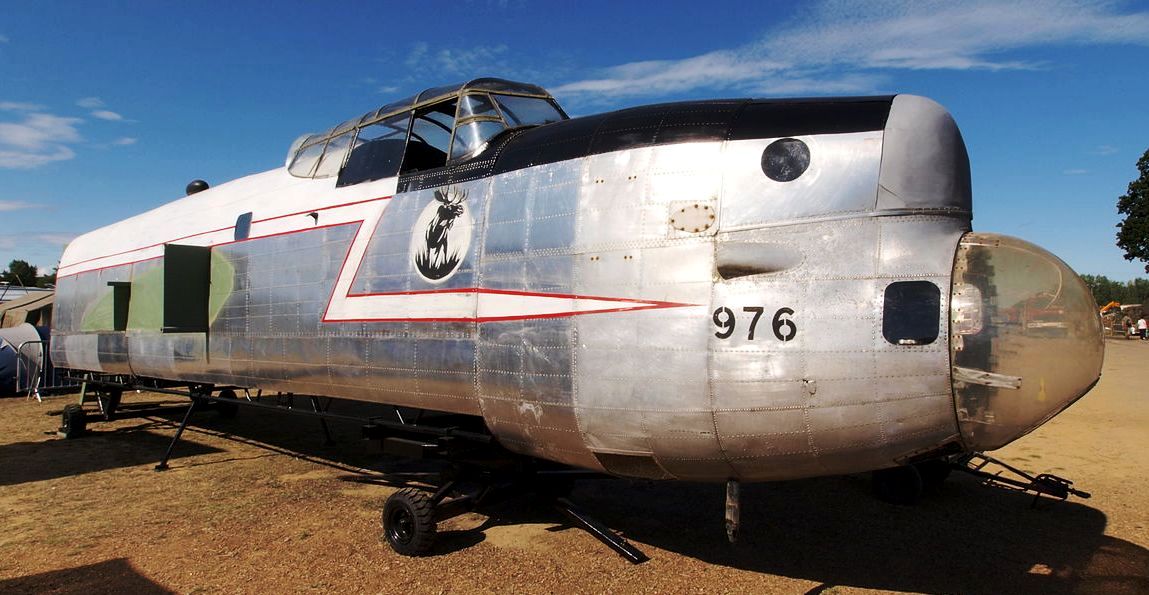 Avro Lancaster B. Mk. X (Serial No. KB976/KB994), Reg. No. G-BCOH, composite forward fuselage, damaged, Boscombe Down Aviation Collection, Wiltshire.