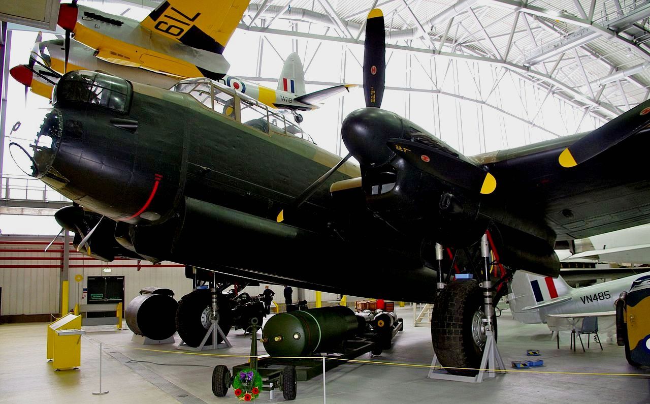 The Lancaster has its origins in the twin-engine Avro Manchester which had been developed during the late 1930s in response to the Air Ministry Specification P.13/36 for a medium bomber for “world-wide use” which could carry a torpedo internally, and make shallow dive-bombing attacks. Originally developed as an evolution of the Manchester (which had proved troublesome in service and was retired in 1942), the Lancaster was designed by Roy Chadwick and powered by four Rolls-Royce Merlins and in one of the versions, Bristol Hercules engines. It first saw service with RAF Bomber Command in 1942 and as the strategic bombing offensive over Europe gathered momentum, it was the main aircraft for the night-time bombing campaigns that followed. As increasing numbers of the type were produced, it became the principal heavy bomber used by the RAF, the Royal Canadian Air Force (RCAF) and squadrons from other Commonwealth and European countries serving within the RAF, overshadowing the Halifax and Stirling, two other commonly used bombers.