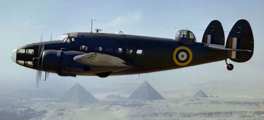 Lockheed Hudson Mk. VI (Serial No. AE626), of the Middle East Communications Flight flying over the Pyramids at Cairo, Egypt, in 1942.