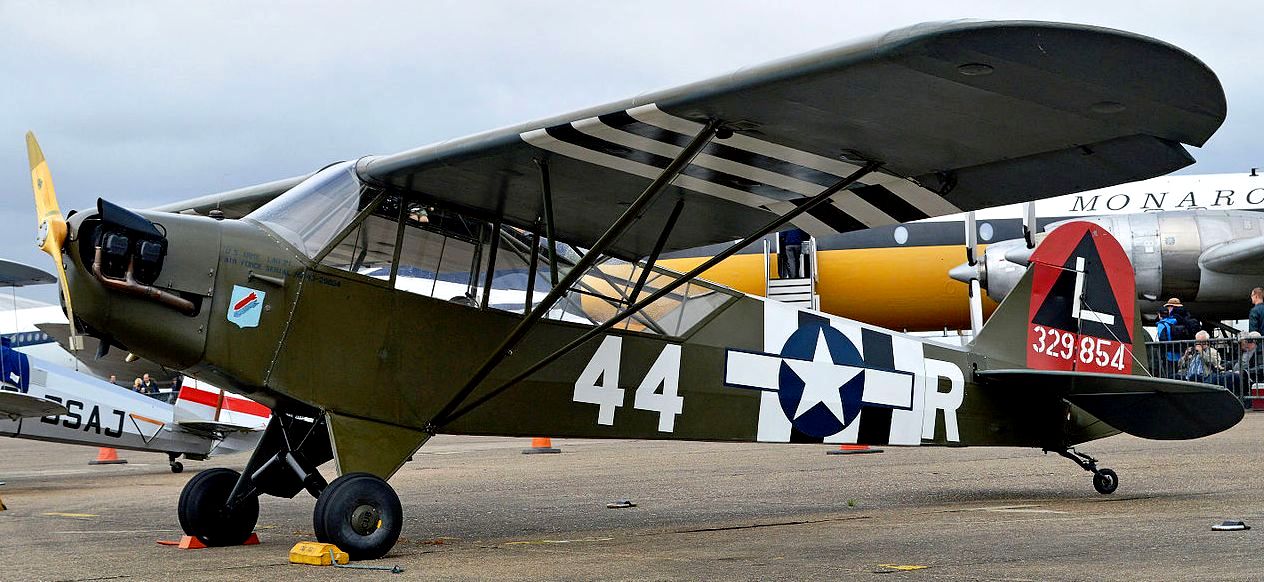 Piper L-4H Grasshopper (Serial No. 44-329854), c/n 11145, in the markings of the 381st Bomb Group, based at Ridgewell, Essex in 1944. This L-4 was taken on charge from the Piper Aircraft Corporation at Lock Haven in January 1944 and first issued to the Eighth Air Force. She served the U.S Ground Forces in Europe possibly with Pattons 3rd Army. In 1947 she was struck of charge and sold as surplus and acquired by a French aero club. She was acquired by a British owner and arrived in the U.K. In 2011 she moved to the Biggin Hill Heritage Hangar Ltd, Biggin Hill, Kent.