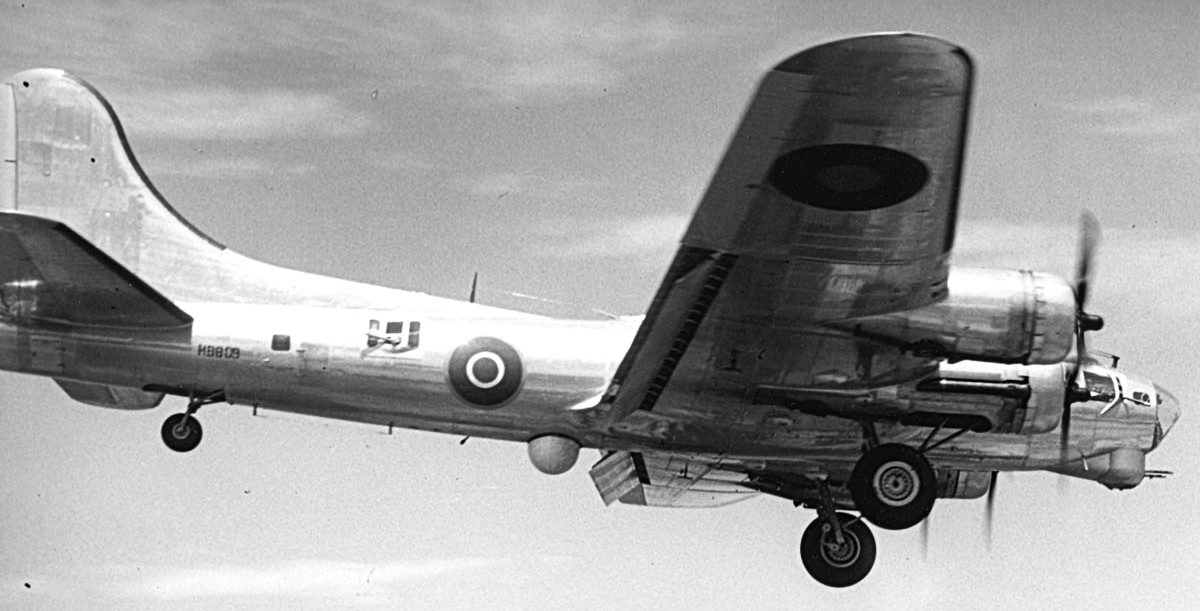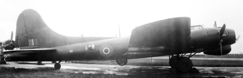 Royal Air Force Fortress B Mark III (serial HB796) at Prestwick, Ayrshire (UK), after being fitted with radio counter-measures equipment by Scottish Aviation Ltd. It served with No. 214 Squadron RAF of No. 100 Bomber Group, based at Sculthorpe, Norfolk, from November 1944. Equipment fitted included American AN/APS15 radar in the large radome under the nose, “Airborne Cigar” (ABC) radio-jamming equipment (shown by the large aerial on top of the fuselage), and an “Airborne Grocer” aircraft radar jamming installation, the aerials of which can be seen on either side of the tail turret. HB796 failed to return from a bomber support mission on 9 February 1945.