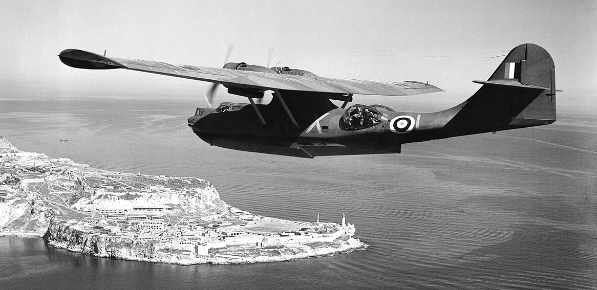 Catalina Mk. I, Z2147 AX-L, of No. 202 Squadron RAF based at Gibraltar, in flight approaching Europa Point on returning from an anti-submarine patrol. While serving with the Squadron, Z2147 was credited with nine successful attacks on enemy submarines.