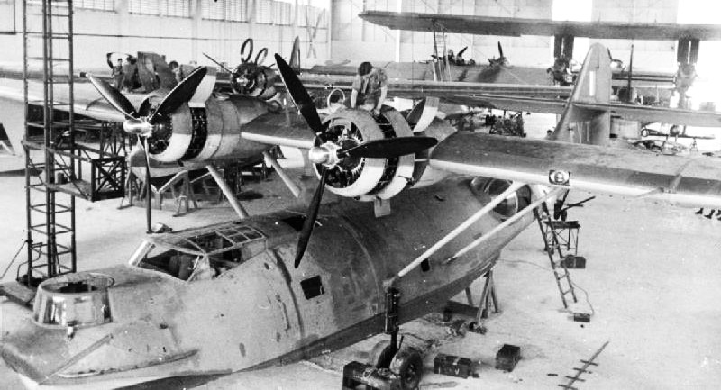 Consolidated Catalina Mark Is of No. 205 Squadron RAF undergoing servicing in their hangar at Seletar, Singapore, in mid-1941. One of the Squadron’s Short Singapore Mark IIIs bi-plane flying boats, which was the type the Catalina was replacing, can be seen in the right background.