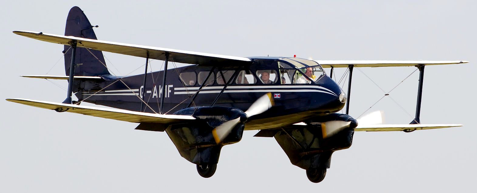 de Havilland DH.89A Dragon Rapide (Serial No. X7344), Reg. No. G-AGJG, Mark and David Miller, Duxford, Cambridgeshire. Airworthy. Ex-RAF Dominie G-AIDL was flown by Allied Airways in the late 1940s, Fox’s Confectionery 1950–59, the Army Parachute Association 1967–77 and Air Atlantique Classic Flight 1995–2009. Since 2009 it has flown from Tangmere Military Aviation Museum.