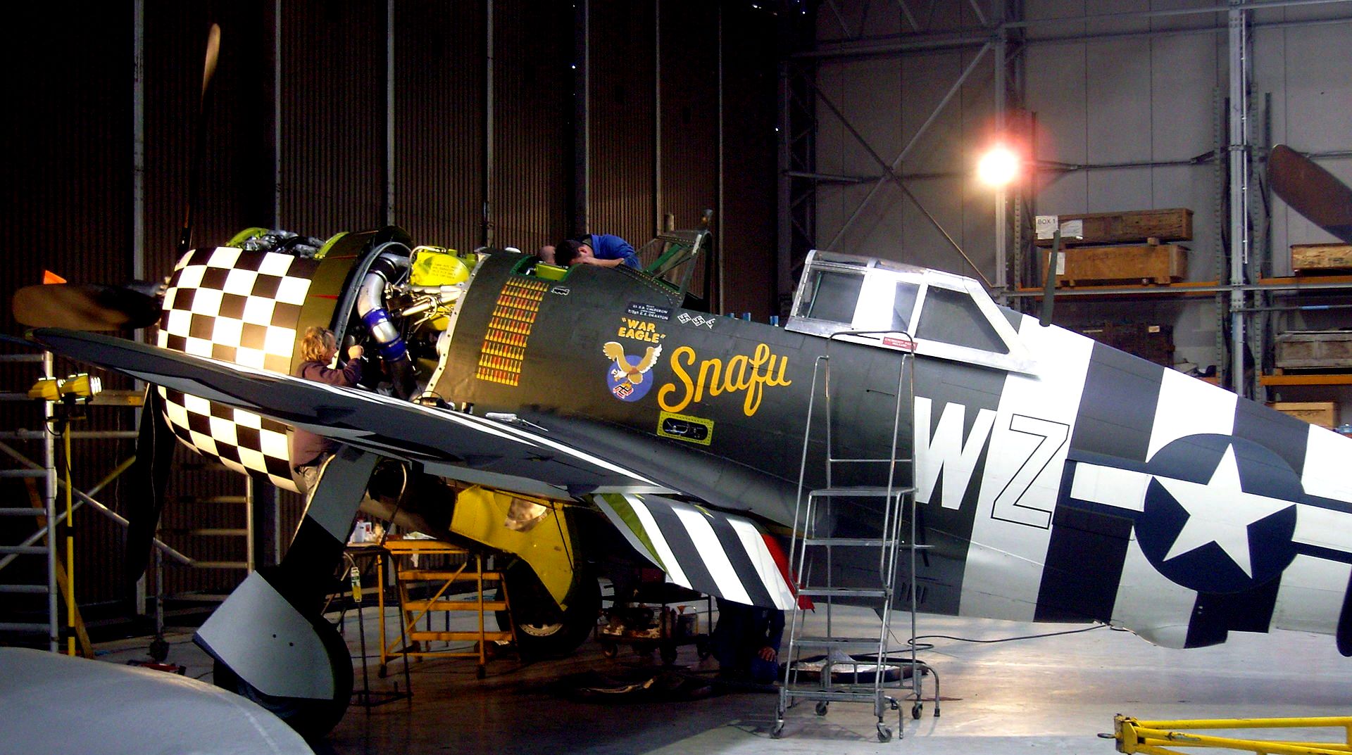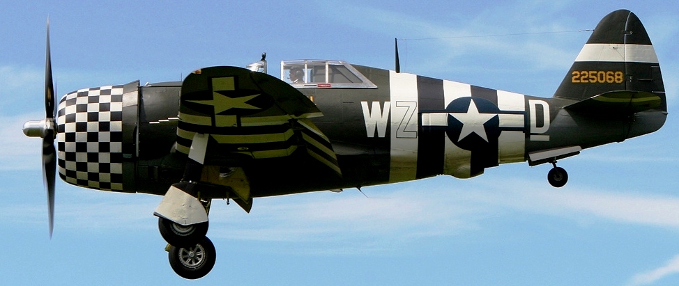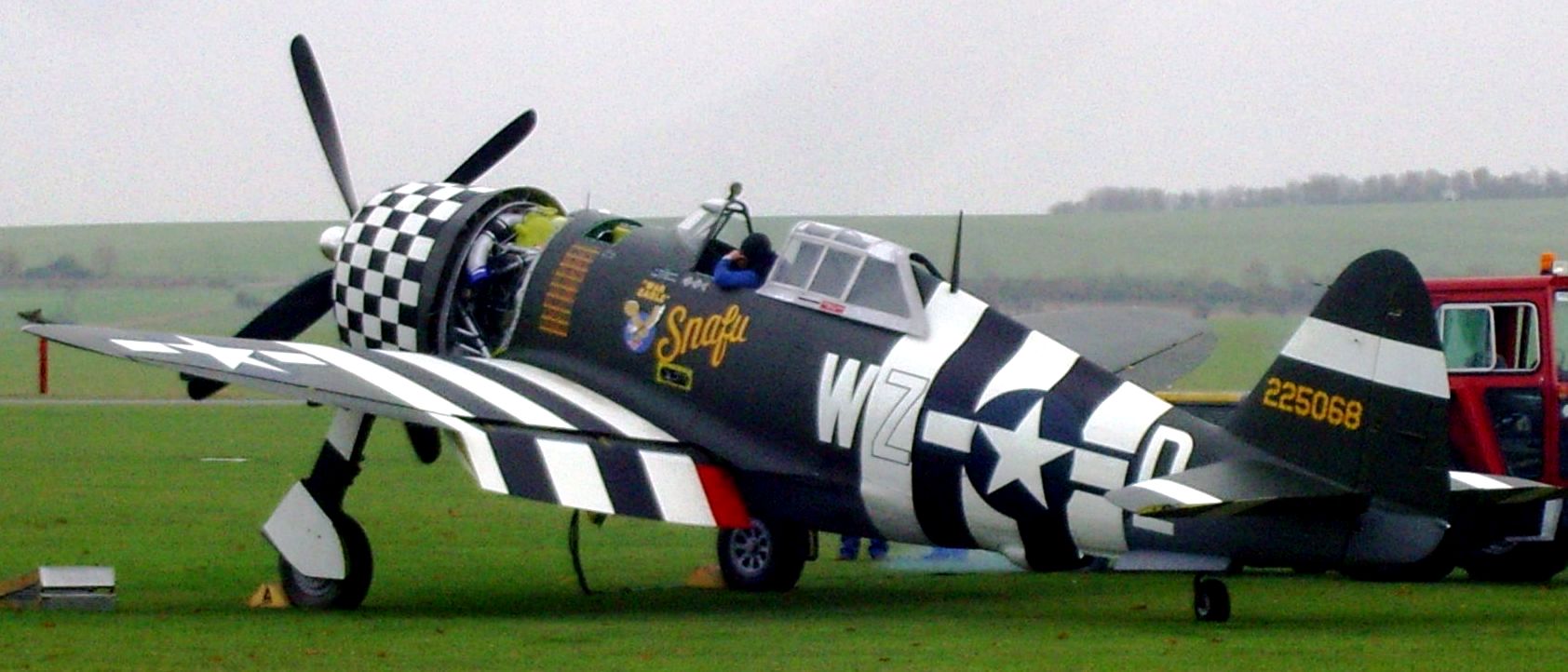 Republic P-47D Thunderbolt Mk. I (Serial No. 42-25068), WZ-D, “Snafu“, the mount of Lt Severino B. Calderon, 84th Fighter Squadron, USAAF in late 1944. Imperial War Museum, Duxford, Cambridgeshire.