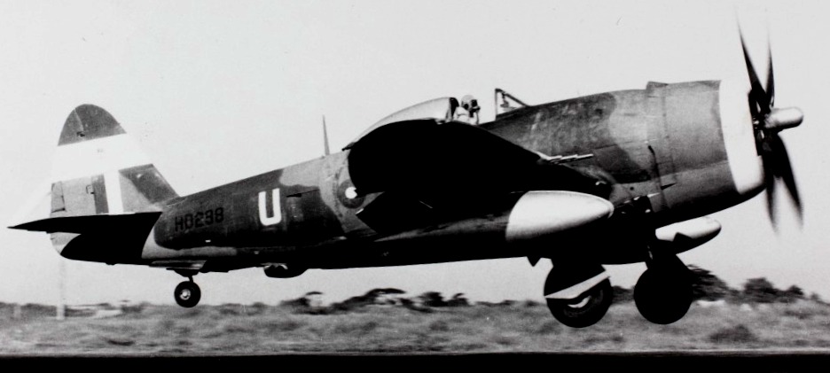 Republic P-47D-27-RE Thunderbolt II (Serial No. 42-26911), acquired by the RAF and designated (Serial No. HD298). This Thunderbolt II is equipped with long-range tanks slung under the main plane, and is just getting airborne from a forward RAF airstrip on the Burma front. It was part of the 135th Squadron, Chittagong, in Nov 1944.