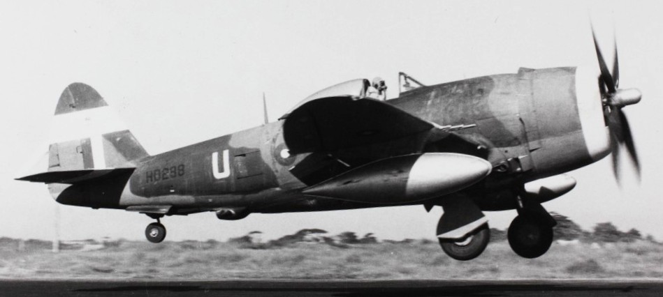Republic P-47D-27-RE Thunderbolt II (Serial No. 42-26911), acquired by the RAF and designated (Serial No. HD298). This Thunderbolt II is equipped with long-range tanks slung under the main plane, and is just getting airborne from a forward RAF airstrip on the Burma front. It was part of the 135th Squadron, Chittagong, in Nov 1944.