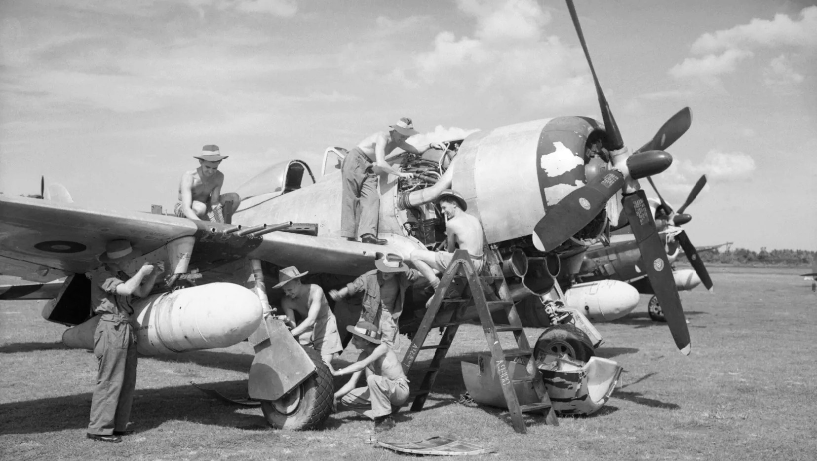Republic Thunderbolt Mk. II, ex-USAAF P-47D-25/-30-RE/30/-40-RA, of No. 81 Squadron, RAF, being prepared for action against Indonesian nationalists at Kemajoran airfield, Batavia, in readiness for operations against Indonesian nationalists at Surabaya (Soerabaja) in Java. The unit, which had been No. 123 (East India) Squadron RAF until 10 June 1945 when it was rebadged, shifted from Chittagong to the Dutch East Indies in November along with No. 60 Squadron (also a Thunderbolt Mk II outfit) and remained there until June 1946, flying tactical reconnaissance duties and covering Allied road convoys, while attacking nationalist held airfields and ammunition dumps.