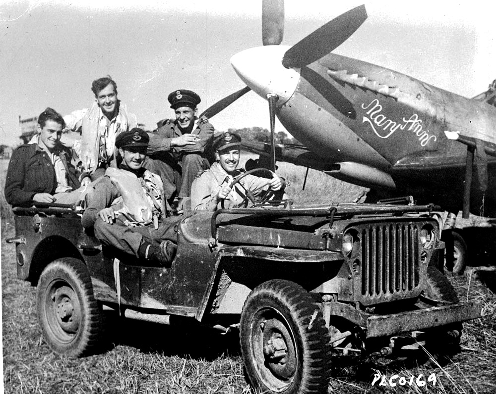Supermarine Spitfire LF Mk. VIIIc (Serial No. JG567), “Mary Ann“, No. 67 Squadron, RAF. Pilots are sitting in a jeep in front of the Commanding Officer’s Spitfire at Akyab, Burma, 9 Jan 1945. This was a day after a section led by the CO shot down five Japanese Nakajima Ki 43 Oscars from a force which attacked the port following its reoccupation. Four of the five Nakajima Ki-43 kills from the 64th Sentai, IJAAF, were confirmed by post-war examination of Japanese records.