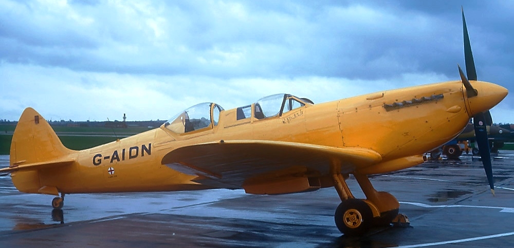 Supermarine Spitfire TR Mk. VIII (Serial No. MT818), c/n 729058), coded G-M, (Spitfire T.8), previously Reg. No. N58JE, now UK Reg. No. G-AIDN, G2 Trust, Wycombe Air Park. Biggin Hill Heritage Hangar, Biggin Hill Airport, Westerham, Kent. Airworthy in the UK. Two-seat trainer built in 1944, restored to airworthy condition by Personal Plane Services, Booker, Buckinghamshire, last seen flying on 30 June 2024. (Wikipedia) This aircraft has been repainted to represent a USAAF Mk. IXc (Serial No. MH894), coded WZ-JJ, “Lady Ellen III“, as flown by Lt John Fawcett of the 31st Fighter Group’s 309th Fighter Squadron between Nov 1943 and March 1944, while assigned to the 12th Air Force in Italy. MT818 is unique as the only surviving Spitfire prototype of any mark. This was the first and only ‘Spitfire High Speed Trainer Prototype’ trainer created by Vickers-Armstrongs.