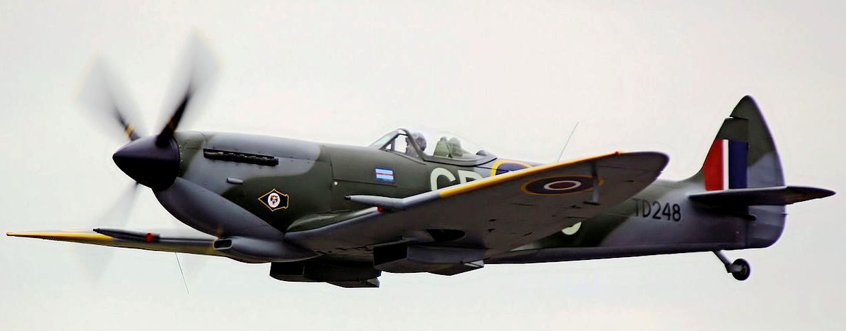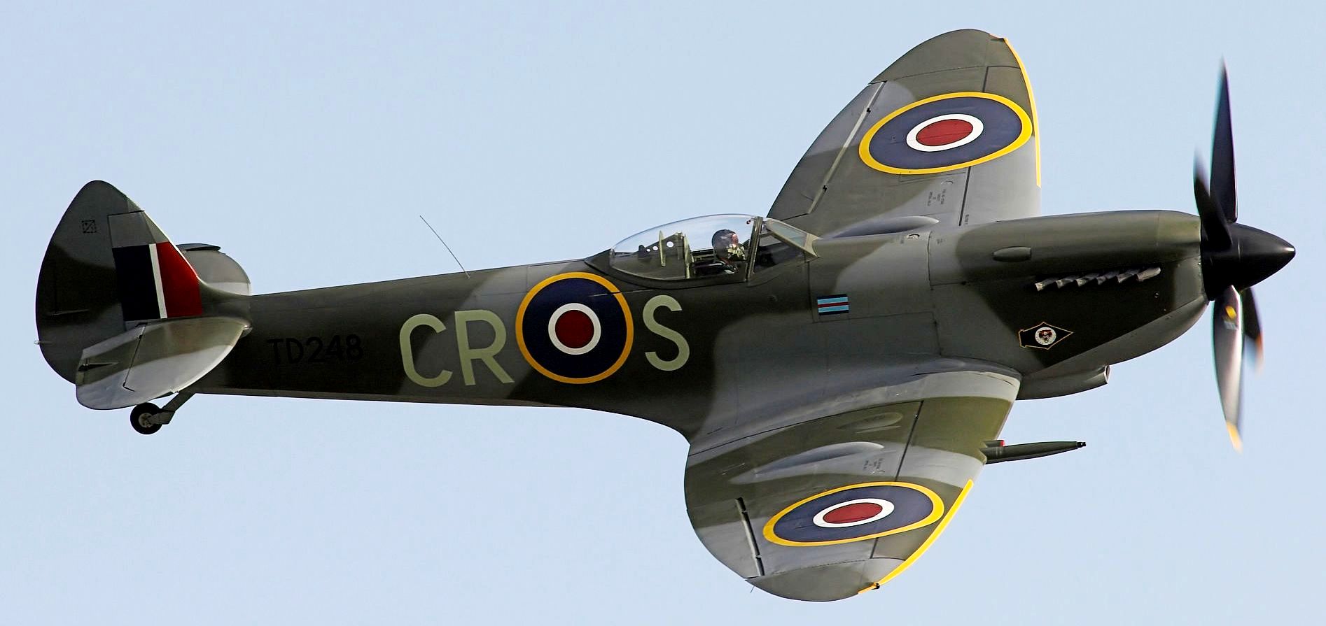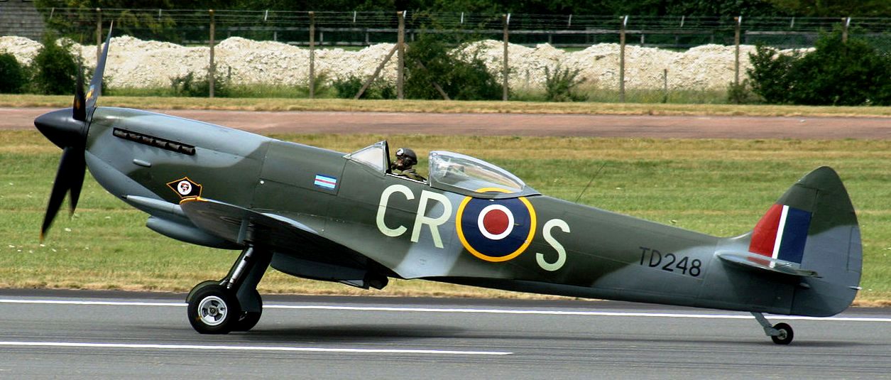 Supermarine Spitfire LF Mk. XVIe (Serial No. TD248), Reg. No. G-OXVI, CR-S, Norfolk and Suffolk Aviation Museum, Flixton, Bungay, Suffolk. Airworthy. Built in 1944 and entered service in 1945. It saw service with No.695 Squadron before being withdrawn from service in 1953. Displayed at Hooton Park, Cheshire before Historic Flying Ltd acquired the Spitfire and began restoration in 1988 for its first post-rebuild flight in 1992. the aircraft now wears the insignia of a No. 74 Squadron Spitfire XVI,[189] but the codes are the initials of its pilot: Cliff Spink. (Wikipedia)