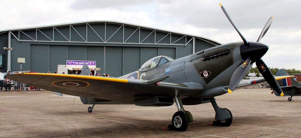 Supermarine Spitfire F Mk. XIVe (Serial No. RN201), Reg. No. G-BSKP. Delivered to Belgian Air Force in 1948 as SG.31, where it served until it was mounted on a plinth after retirement. It remained as a monument at Beauvechain until it was acquired by the Historic Aircraft Collection in 1990 for restoration. Restored by Historic Flying Limited in 2002 and was registered as G-BSKP.[183] In 2007 it was exported to the United States where it received the registration N201TB. It was cancelled in 2019 and exported to the UK[184] and re-registered as G-BSKP, before flying again on 9 June 2020 at Sywell.[185] The aircraft is now back at Duxford with the Aircraft Restoration Company (ARCo). (Wikipedia)