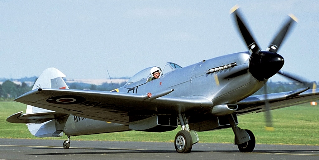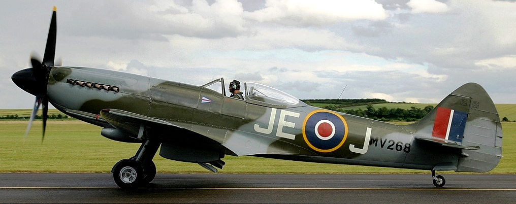Supermarine Spitfire FR Mk. XIVe (Serial No. MV293), Reg. No. G-SPIT, JE-J, 127 Wing, painted as (Serial No. MV268), The Fighter Collection, Duxford, Cambridgeshire. Airworthy. MV293 was built in late 1944 and was sent to the Royal Indian Air Force in 1945. Nothing is known about its service in India, but the airframe was brought back to the UK in 1978 by Warbirds of Great Britain for restoration. Initially registered as G-BGHB but was later registered as G-SPIT before being acquired by The Fighter Collection and had its first flight after restoration in 1992. The plane used to be painted as an overall silver with codes OI-C to represent post-war RAF Spitfires, but in 2000 it was repainted in the markings of MV268, JE-J, the markings of Johnnie Johnson’s Spitfire Mk.XIV. (Wikipedia)