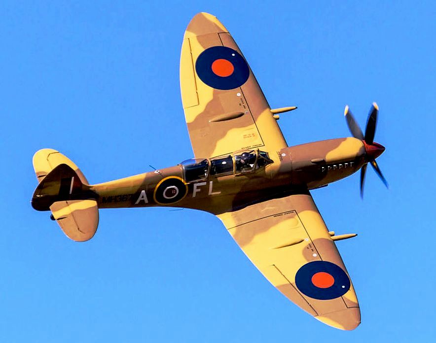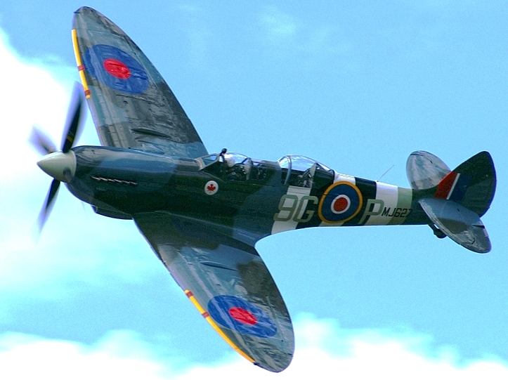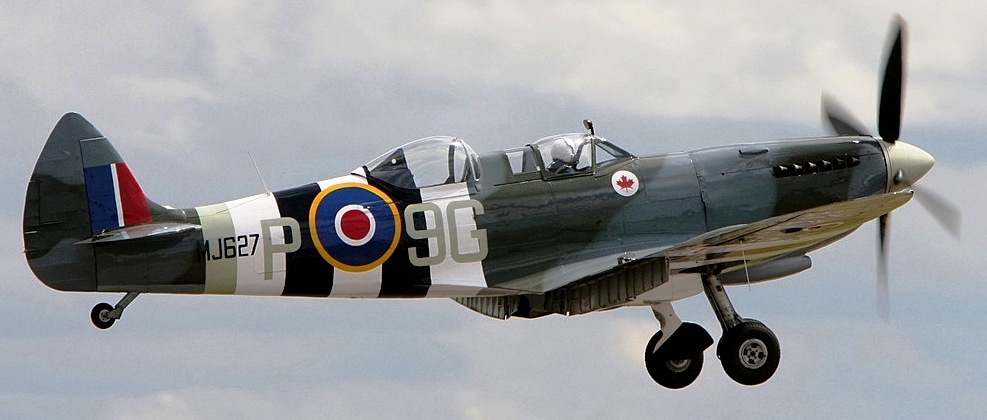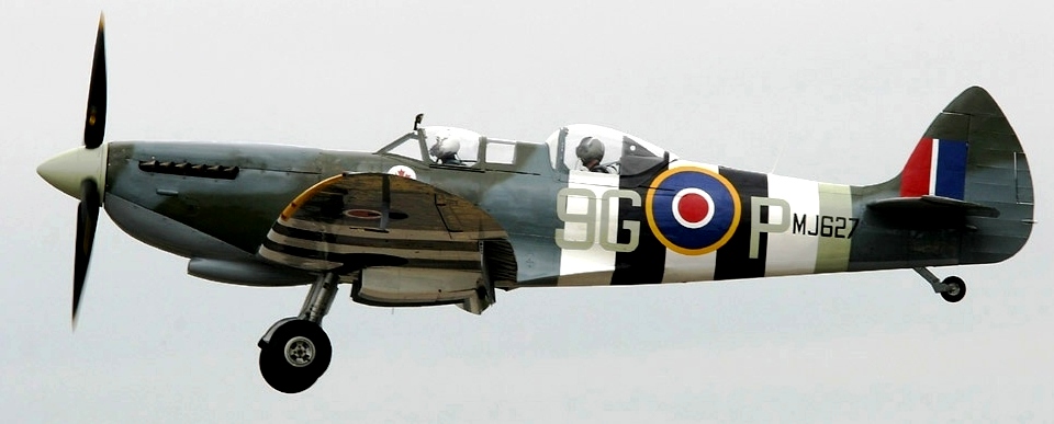 Supermarine Spitfire Tr. 9 (Serial No, MJ772), coded NL-R, Reg. No. G-AVAV. This aircraft was built as a Mk. IX in 1943, served with No. 341 Squadron as MJ772, NL-W, then with No. 340 Squadron as MJ772, GW-A. It was sold to Vickers-Armstrongs in 1950, and converted to a two-seat trainer. It carried Class B markings G-15-172. It then went to the Irish Air Corps in May 1951 as 159. It was withdrawn from flying in 1960. MJ772 was sold to Film Aviation Services in November 1963 and stored at Biggin Hill. It was then sold to COGEA, Belgium in May 1964 and stored at Ostend Airport. Sold to Tony Samuelson in 1965 and registered G-AVAV in November 1966. Restored to airworthy condition in July 1967. Leased to Spitfire Productions Ltd for use in the film Battle of Britain. A forced landing was made at Little Staughton on 9 July 1968 due to engine failure, but it was subsequently returned to flying condition. Later sold to Sir William Roberts and displayed as part of the Strathallan Collection, coded MJ772, NL-R. It was sold to Doug Champlin of Enid, Arizona, Reg. No. N8R. Later registered in Germany as D-FMKN. It suffered off-airport landing in a field near Woodchurch, Kent in the UK on 7 September 2015. The pilot was uninjured. MJ772 is awaiting repairs and is currently stored at Biggin Hill.