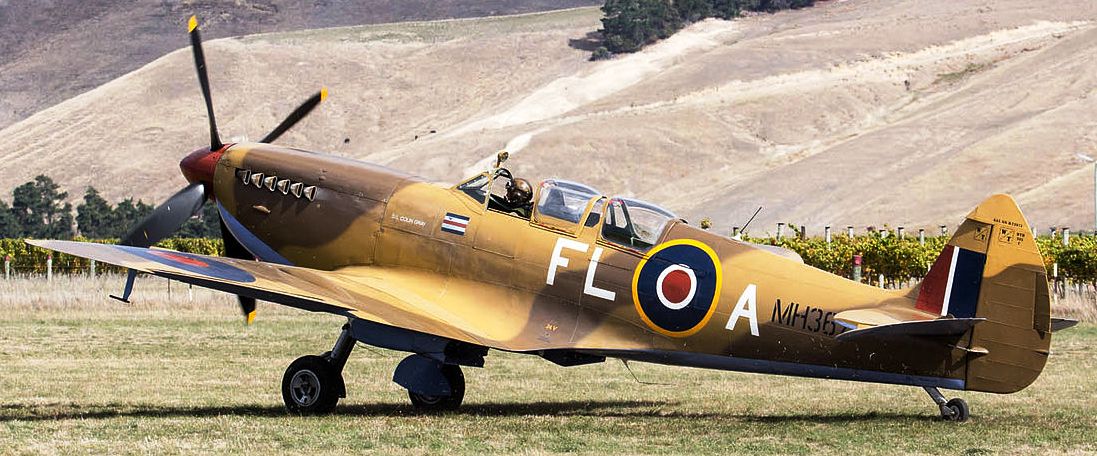 Supermarine Spitfire Tr. 9, RAF (Serial No. MH367), (ZK-WDQ). Previoously owned by noted aerobatic pilot Doug Brooker and arrived in New Zealand on 11 September 2008. It wears RAF desert colours with the markings of FL-A, a Mk. IX flown by New Zealand Squadron Leader Colin Gray, C/O of No. 81 Squadron, RAF, when based in Tunisia in mid-1943. On 15 January 2009, during a transit flight from Auckland, the Spitfire suffered a heavy forced landing on Hood Aerodrome, near Masterton. The propeller, undercarriage and some fuel lines were damaged but the aircraft was repaired. A second landing accident at Ardmore Airport on 2 December 2009 resulted in damage to the undercarriage and propeller. It is believed that a sudden change in wind direction caused the aircraft to run off the end of the runway. On 12 June 2011 the aircraft suffered yet another landing accident, this time tipping onto its nose after landing at Ardmore, damaging the propeller. Transferred to the UK on 13 Nov 2024, Ultimate Warbird Flights at Sywell, Northamptonshire