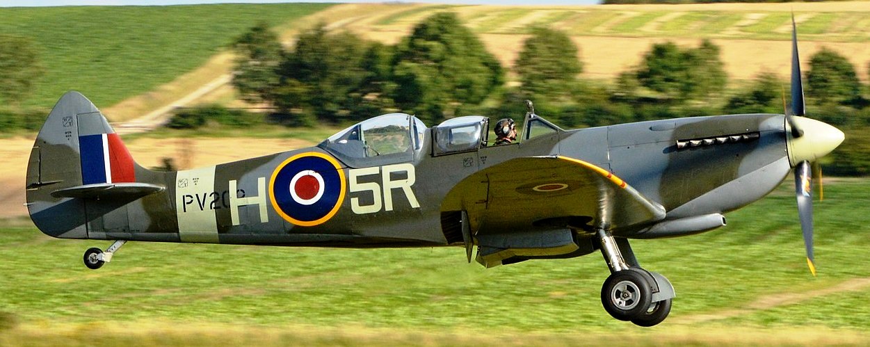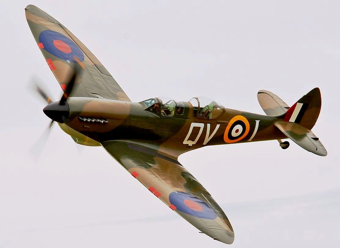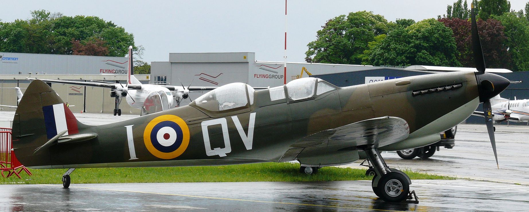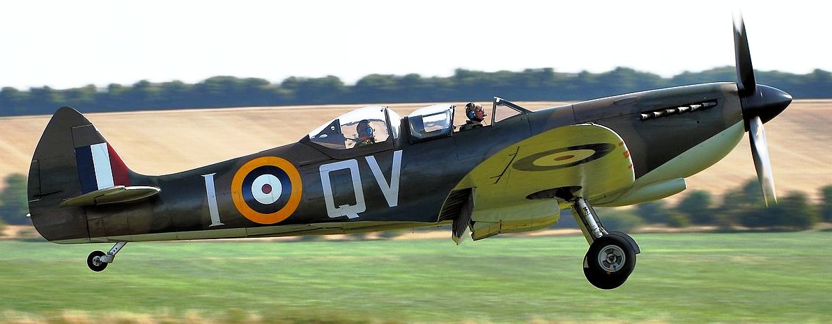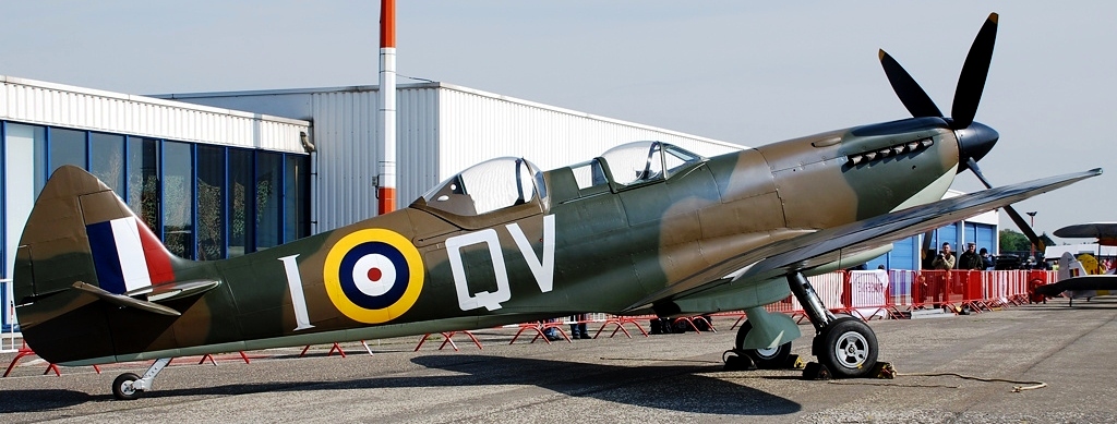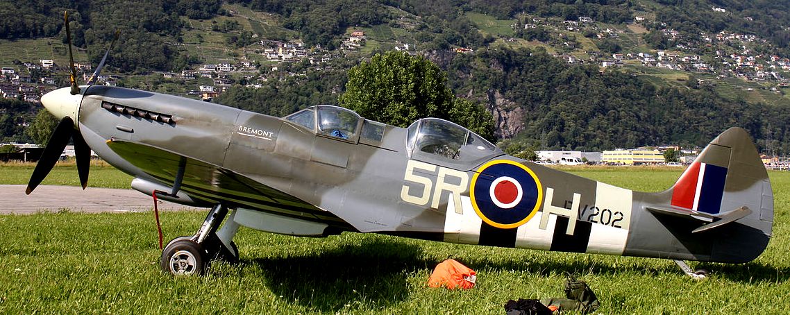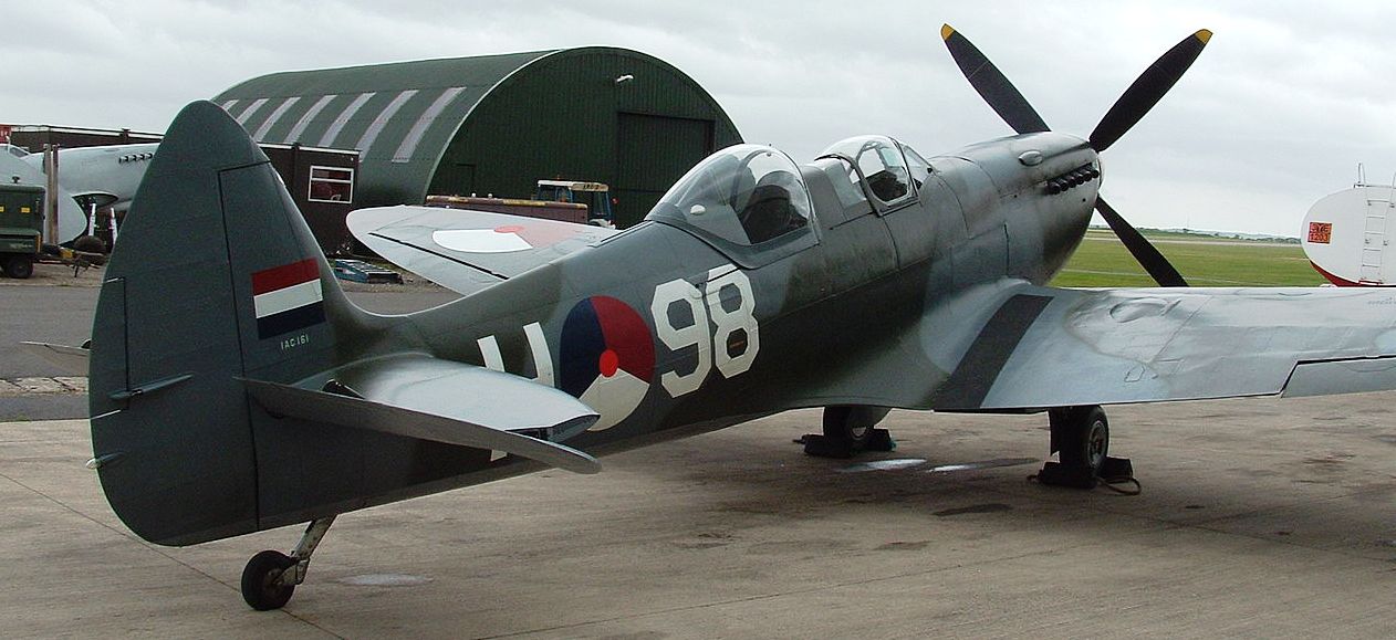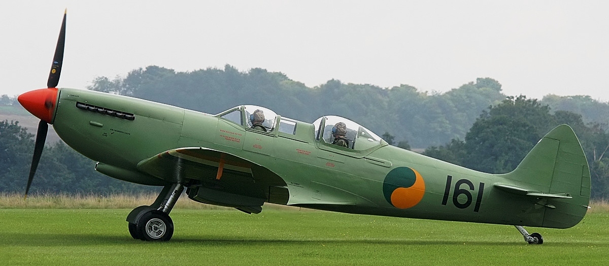 Supermarine Spitfire Tr. 9 (Serial No. PV202), coded QV-I, No. 33 Squadron RAF, Reg. No. G-CCCA, Historic Flying Ltd, Duxford, Cambridgeshire. Airworthy. Served with 33 Squadron, 5R-Q, then with 412 Squadron as WZ-M, later coded WZ-W. To 29 Maintenance Unite in July 1945. Sold to Vickers-Armstrongs in 1950 and converted to two-seat trainer. Carried Class B marks G-15-174. To Irish Air Corps in June 1951 as IAC 161. Flew until 1 December 1960 when withdrawn from active service due to a crack in the undercarriage strut. Became an instructional airframe. Sold to Sir William Roberts in April 1970, to Strathallan Collection in 1972. Sold in 1979 to Nick Grace, later sold to Steve Atkins. Registered G-BHGH, later re-registered G-TRIX. Subsequently, sold to Richard Parker and restored to airworthy condition, it was flown again after restoration on 23 February 1990. Sold to Rick Roberts in 1992. Following a major accident at Goodwood in April 2000, the aircraft was sold to Karel Bos / Historic Flying Limited, based at Duxford and was rebuilt. Re-registered G-CCCA. Returned to an airworthy condition as Irish Air Corps IAC 161, subsequently operated in Royal Netherlands Air Force livery as H-98. As of October 2016, airworthy marked as 5R-H. Operated by the Aircraft Restoration Company (ARCo) and Aerial Collective Duxford, based at Duxford. (Wikipedia)