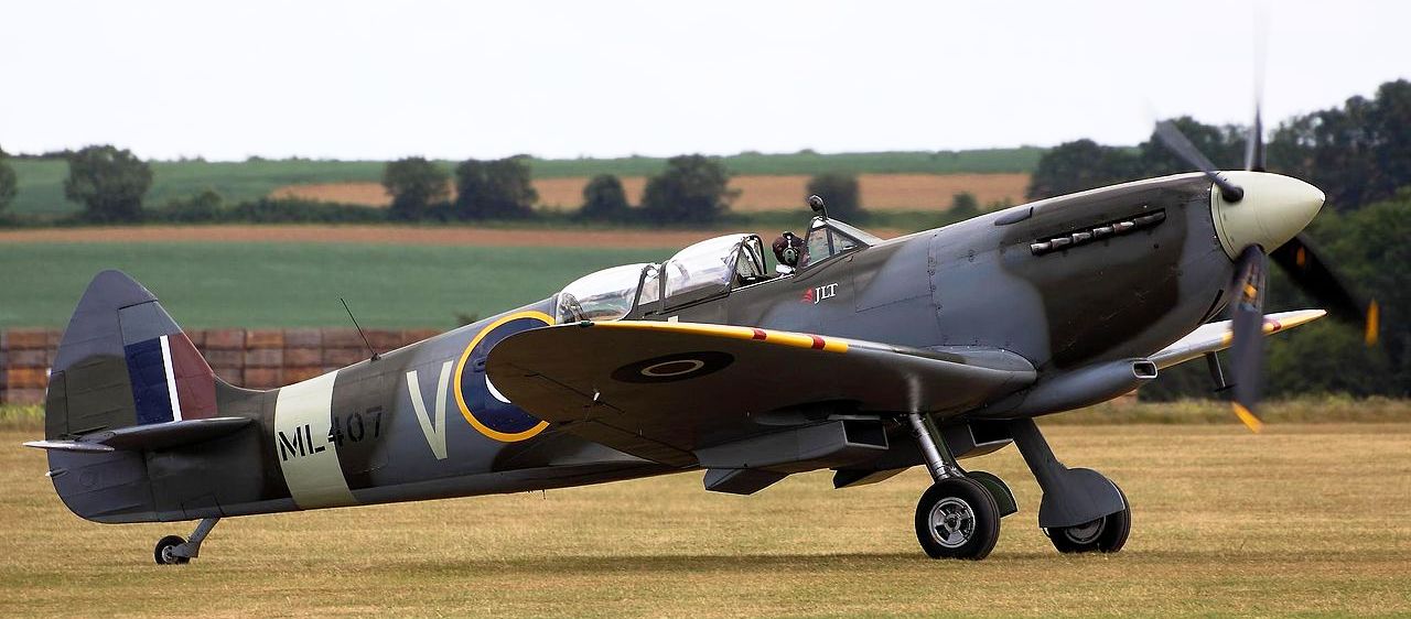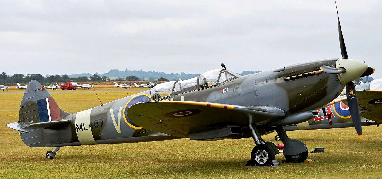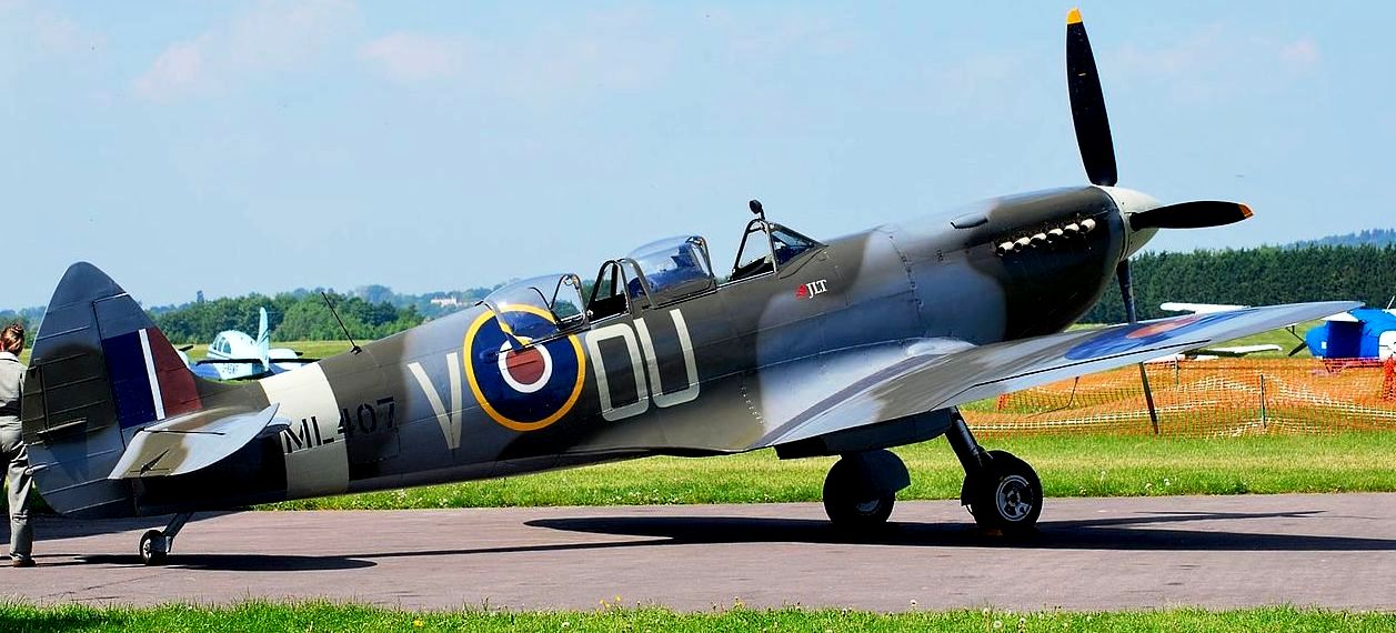 Supermarine Spitfire Mk. Tr. 9 (Serial No. ML407), coded OU-V, Reg. No. G-LFIX, No. 485 Squadron RNZAF, Carolyn Grace, RAF Bentwaters. Airworthy. Served with 485 Squadron, Royal New Zealand Air Force as OU-V. Participated in Operation Overlord. Subsequently, served with 341 Squadron, Royal Air Force coded NL-D, 308 Squadron, coded ZF-R, 349 Squadron, coded GE-P, 345 Squadron, coded 2Y-A and 332 Squadron, coded AH-B. To 151 Repair Unit in April 1945 and 29 Maintenance Unit in October 1945. Sold to Vickers-Armstrongs in 1950 and converted to a two-seat trainer. Flew under Class B markings G-15-175. To Irish Air Corps in August 1951 as IAC 162. Withdrawn from service on 8 July 1960 and stored. Sold to Tony Samuelson in March 1968, then to Sir William Roberts in 1970 and Nick Grace in 1979. Restored to airworthy condition in 1985, registered G-LFIX. Owned by Carolyn Grace and as of October 2016 based at Sywell, it wears the markings it wore when serving with 485 (New Zealand) Squadron. (Wikipedia)