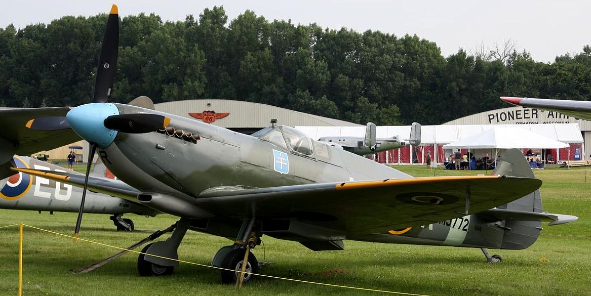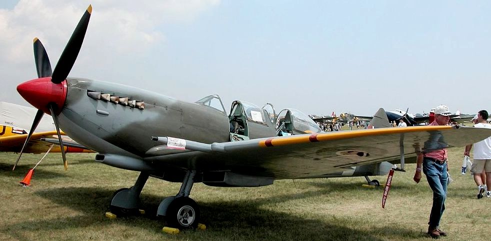 Supermarine 361 Spitfire Mk. IX (Serial No. TE308), previously flown as Reg. No. N308WK, William S. Greenwood, of Aspen, Colorado. This aircraft is a two-seat variant, with previous service with the Irish Air Force. It is currenly udergoing restoration to flight condition at the Biggin Hill Heritage hangar in South East London. Built in 1944 it did not fly on operations during the war. It was previously registered in Canada as CF-RAF and in the USA as Reg. No. N92477. Initially allocated to 33 Maintenance Unit, then to 29 Maintenance Unit. Sold to Vickers-Armstrongs in July 1950. Converted to a two-seat trainer. Flew under Class B markings G-15-176. To Irish Air Corps in July 1951 as IAC 163. Wheels-up landing on delivery at Baldonnel Airfield on 30 July. Withdrawn from service 9 September 1961. Sold to Tony Samuelson in April 1968, registered G-AWGB. Restored to flying condition in a month. Appeared in the movie Battle of Britain and was also used for aerial filming where a camera was placed in the front cockpit allowing ‘through the windscreen’ shots to be captured, many of which appear in the film. Sold to Sir William Roberts in April 1970 then sold to Don Plumb in July. Registered CF-RAF. Reconverted to single-seater in 1973. Sold to Thomas Watson and registered N92477. Sold to Woodson K. Woods and reconverted to two-seater in 1979, re-registered N308WK. Sold to Bill Greenwood in 1983. Suffered an accident at Galveston, Texas on 26 April 2008. As of October 2016, under restoration to airworthy condition by QG Aviation. Its US civil register of N308WK was cancelled and was sold to the Biggin Hill Heritage Hangar in 2019. The Spitfire flew again in August 2020 in the markings of No. 457 Squadron RAAF. (Wikipedia)