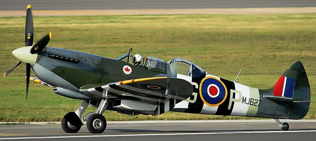 Supermarine Spitfire Mk. IXT, converted to Tr. 9 (Serial No. MJ444), Reg. No. G-LEGD, “Lady Luck“, restored to flight status, Aero Legends, North Weald. MJ444 was built in 1943 as a single-seat Mk. IX and served with Nos. 402, 411 and 443 Squadrons RCAF. MJ444 was lost over Belgium on 13 Jan 1945 while flying with No. 443 Squadron. The pilot, F/L Hal Fairfield, managed to escape. MJ444 was discovered and salvaged in 2020. (Flypast). Restoration was completed on 6 June 2024, when it made its first post-rebuild flight. (Wikipedia)