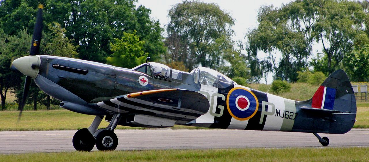 Supermarine Spitfire Tr. 9 (Serial No. MJ627), coded 9G-Q, No. 441 Squadron RCAF, Reg. No. G-BMSB, R.V. Aviation, Biggin Hill Heritage Hangar, Biggin Hill Airport, Westerham, Kent. Airworthy. Served with No. 441 Squadron, RCAF, coded 9G-Q. Sold in 1950 to Vickers for conversion into a two-seat trainer, carried Class B markings G-15-171. To Irish Air Corps in June 1951 as IAC 158; ground instruction airframe from April 1960. Sold to Tim Davies in February 1964, registered G-ASOZ. Sold to Maurice Bayliss in September 1976, re-registered G-BMSB. Restored to airworthy condition and flew again on 8 November 1993 marked 9G-Q. As of October 2016 owned by Warbird Experiences Ltd, based at Biggin Hill airfield. (Wikipedia)