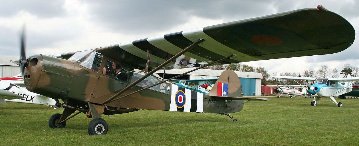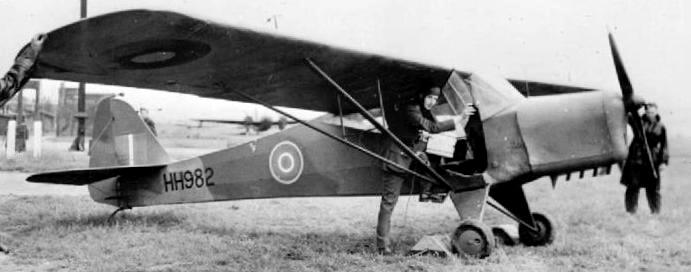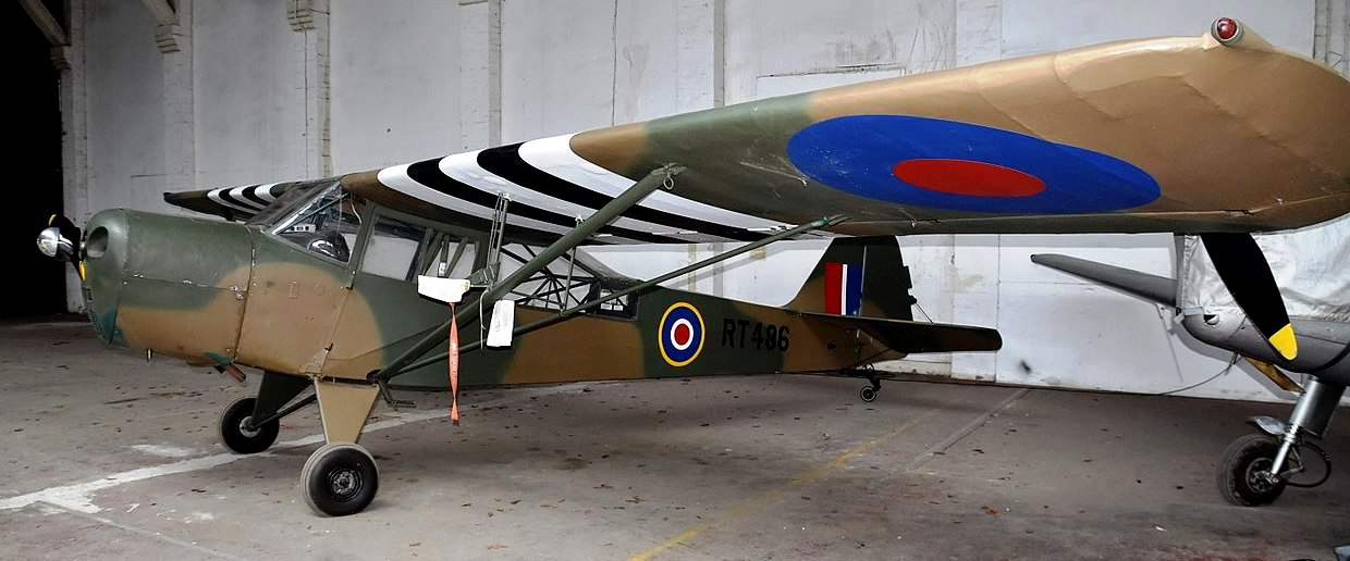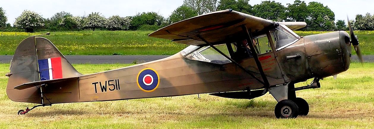 Taylorcraft Auster AOP, Taylorcraft Plus C/2, (Serial No. HH982), of No. 651 (AOP) Squadron RAF, about to depart on a training flight from Old Sarum, Hampshire. Formerly a civilian machine (registration G-AFVA), impressed in August 1941, HH982, went on to serve with Nos. 653 and 654 (AOP) Squadrons RAF, and with No. 2 Group Communications Flight, before being restored to the civilian register as G-AHAE in December 1945.