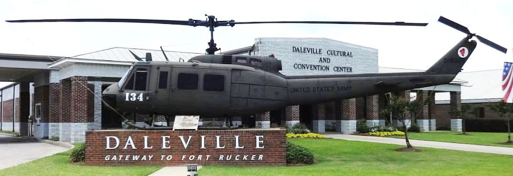 Bell UH-1H Iroquois Helicopter (Serial No. 66-16325), 134, C/N 8519.  This helicopter is mounted on a brick display stand marked “Daleville, Gateway to Fort Rucker”.